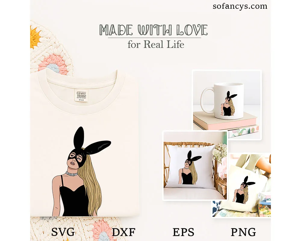 Sofancys proudly presents the Ariana Grande Bunny Mask SVG – Pop Star Bunny Ears Design, a stylish illustration inspired by iconic pop star fashion. The design features a glamorous singer wearing a sleek black bunny mask with long ears, paired with a chic outfit and elegant accessories. The minimal yet striking style highlights modern pop culture aesthetics and bold stage presence. Perfect for Cricut projects, shirts, stickers, tote bags, and fan-inspired crafts, this SVG design captures the confident attitude, fashion, and iconic look loved by pop music fans.