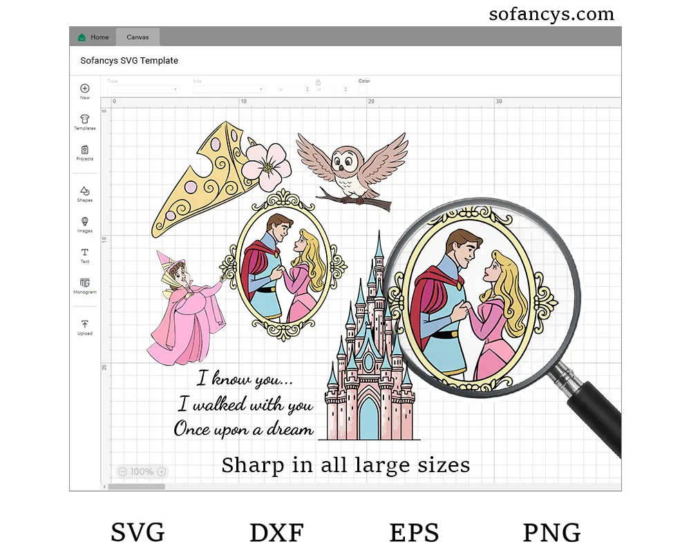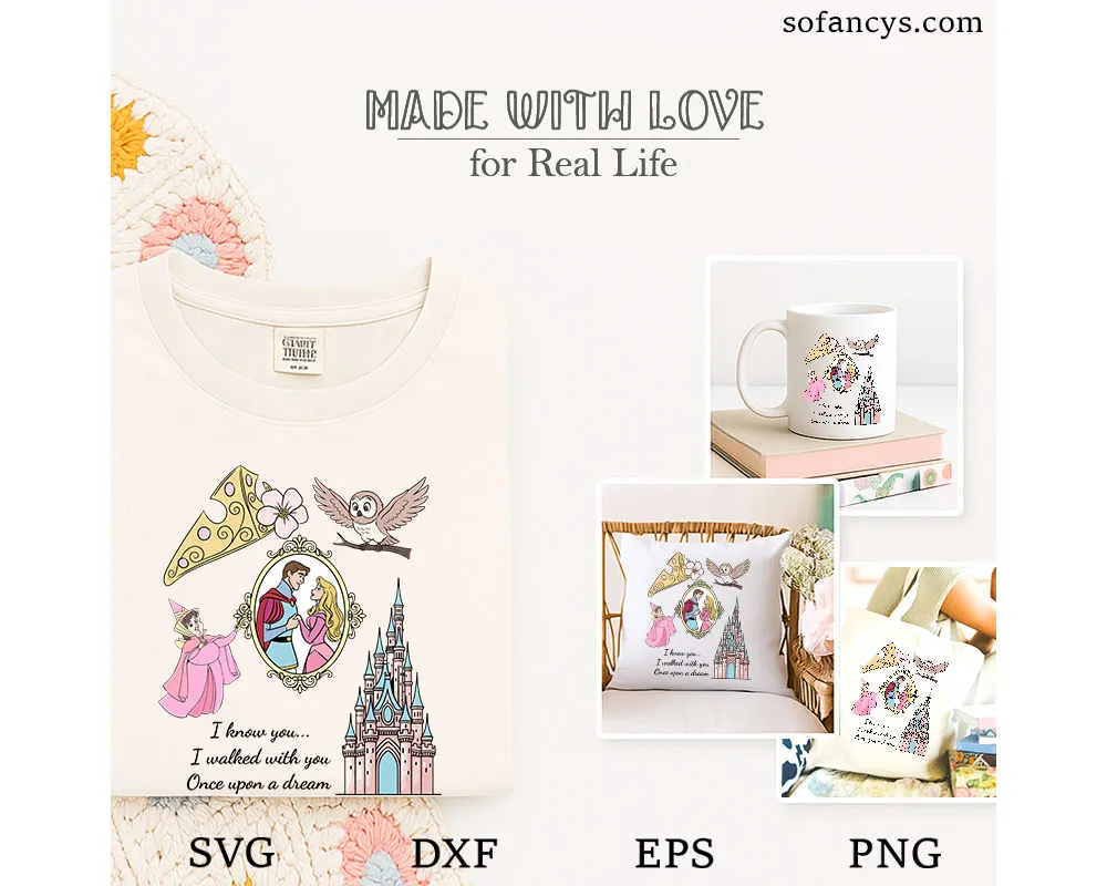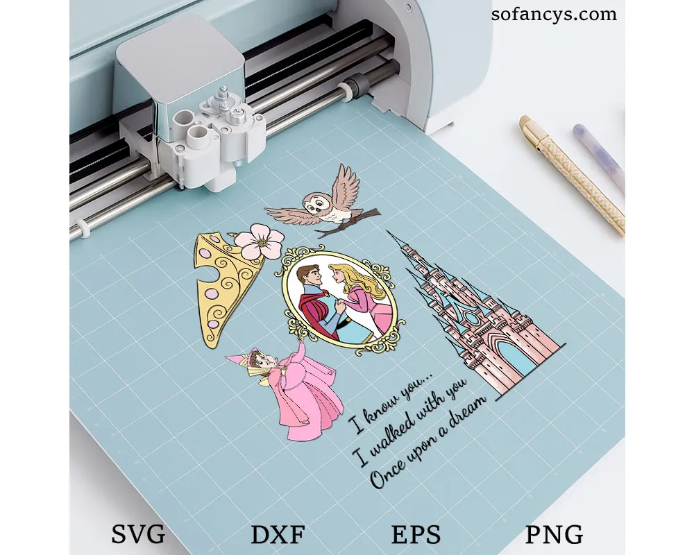 Sofancys presents the Aurora Sleeping Beauty SVG – Once Upon a Dream Castle Design, a dreamy fairytale design capturing Princess Aurora and Prince Phillip surrounded by the enchanted castle, fairy godmother, and magical details. The quote “I know you, I walked with you once upon a dream” adds romantic elegance, perfect for Cricut and Silhouette crafts like shirts, mugs, or wall art inspired by Disney’s timeless love story.