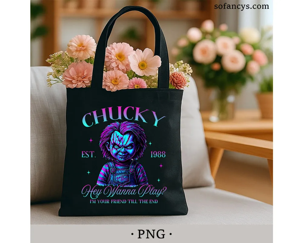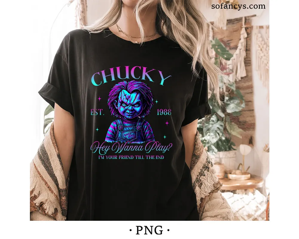 Sofancys introduces the terrifying Chucky Horror Halloween PNG – Hey Wanna Play Design, showcasing the infamous killer doll with neon retro colors and haunting details. Featuring his stitched face, messy hair, and “Good Guys” overalls, this design includes the chilling phrase “Hey Wanna Play? I’m Your Friend Till The End.” Perfect for horror fans, it adds a sinister vibe to shirts, posters, and Halloween crafts. With bold colors and spooky charm, this Chucky PNG is a must-have for creating creepy and unforgettable Halloween projects.