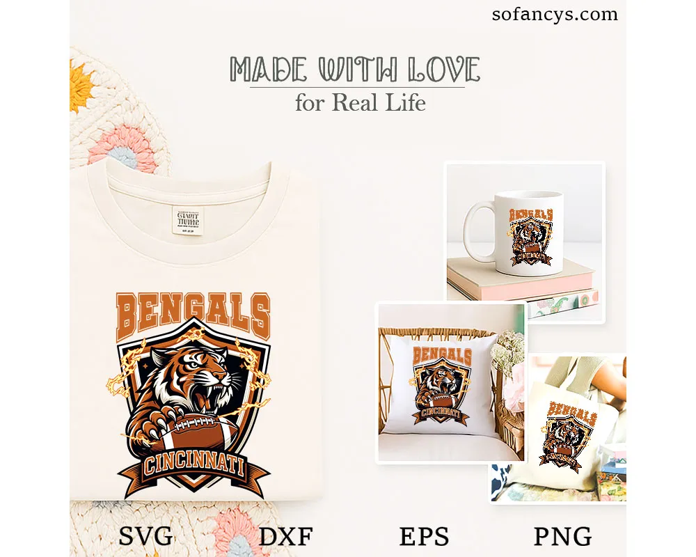 Please note that you’re just purchasing a digital design titled “Cincinnati Bengals Tiger Football Digital File”. In other words, this is not a physical product that will be shipped to your home. All files will be delivered digitally for instant download.