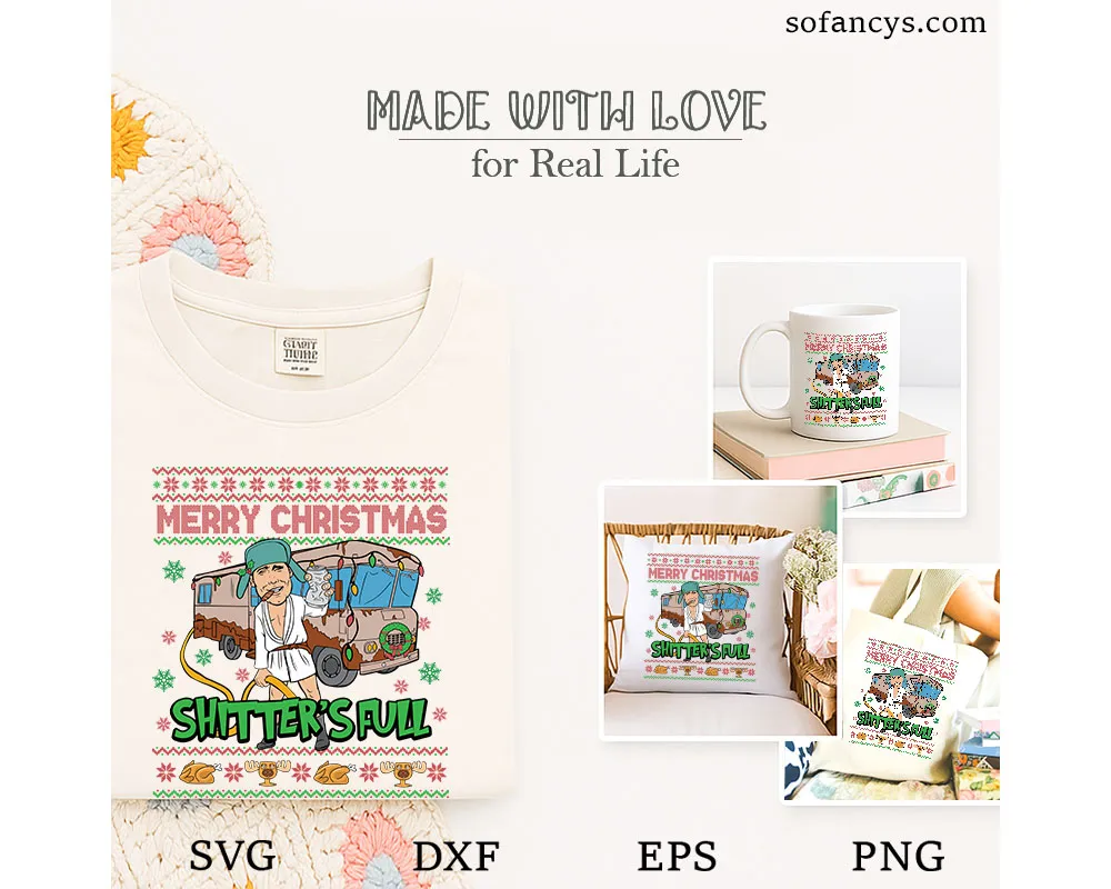 Sofancys introduces this hilarious Cousin Eddie Shitter’s Full SVG – Funny Christmas RV Design, a bold and comedic Christmas design perfect for fans of classic holiday humor. The artwork features a quirky character in a festive robe, standing proudly beside a decorated RV while holding a hose and coffee cup. Surrounded by fun ugly-sweater patterns, snowflakes, turkeys, and moose mugs, this playful scene captures the chaotic charm of an unforgettable holiday moment. Ideal for shirts, mugs, ornaments, and gag gifts, this design brings laughter and personality to every Christmas project.