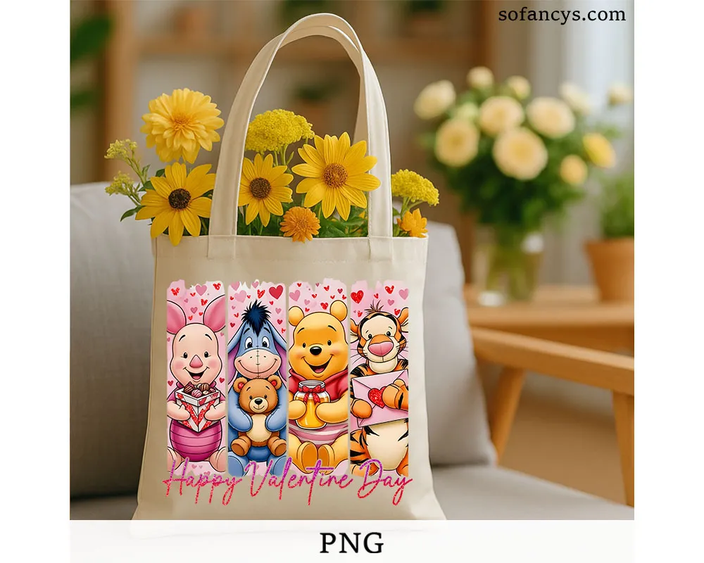 Sofancys presents a sweet and colorful Valentine illustration featuring adorable bear and friends sharing gifts, hearts, and warm smiles across vertical panels. This lovable artwork is perfect for romantic crafts, shirts, cards, and printable decorations. Cute Pooh Friends Valentine PNG – Disney Love Heart Gift Design highlights soft colors, cozy character moments, and heart-filled details that make every project feel joyful and special. Ideal for couples, family gifts, and Valentine DIY creations using high-quality digital PNG files.