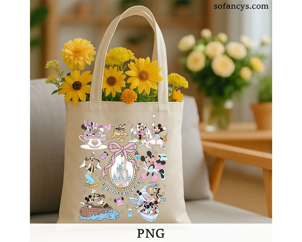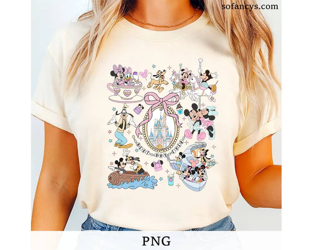 Sofancys introduces a dreamy pastel illustration featuring beloved Disney icons in the charming “Disney Best Day Ever PNG – Mickey Minnie Coquette Park Design”, capturing magical park moments with Minnie, Mickey, Daisy, Goofy, and Pluto. The artwork highlights carousel rides, teacups, log adventures, and a sparkling castle framed by a delicate coquette bow. Perfect for shirts, scrapbooks, and party décor, this design brings nostalgic joy and the enchanting essence of a perfect Disney day.