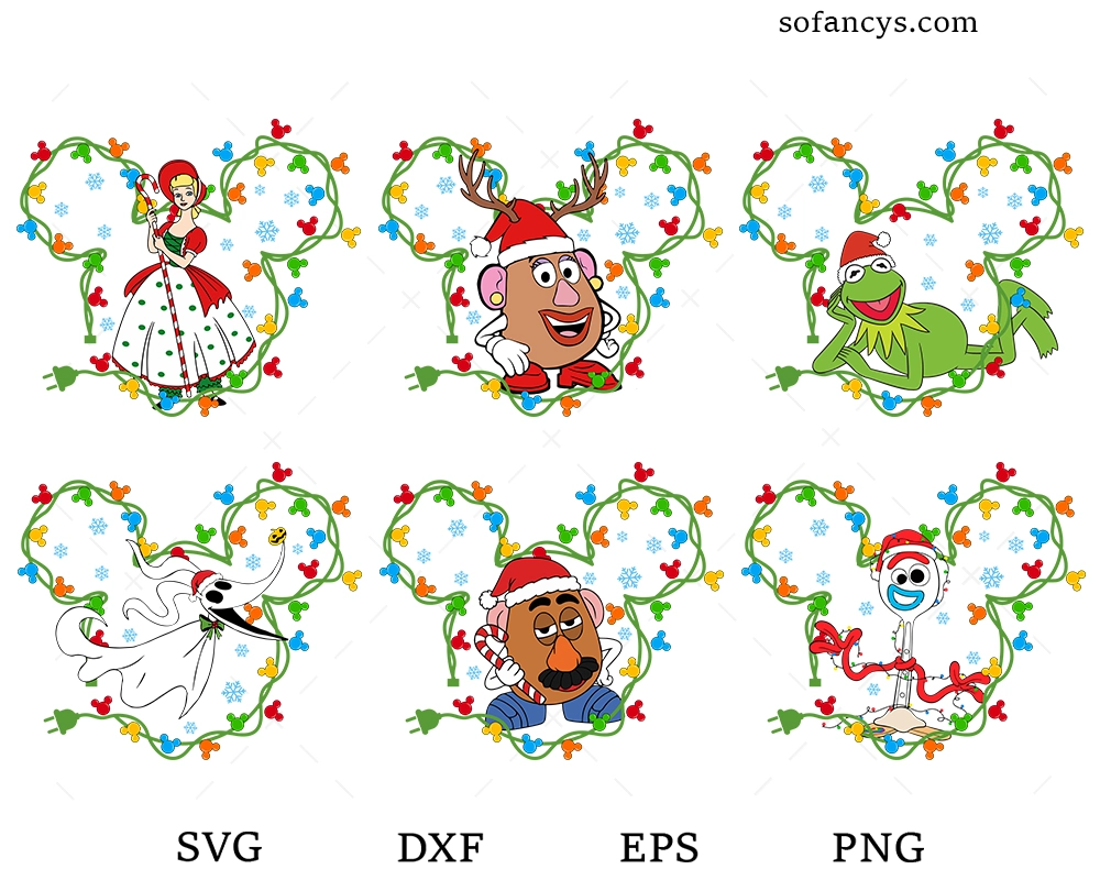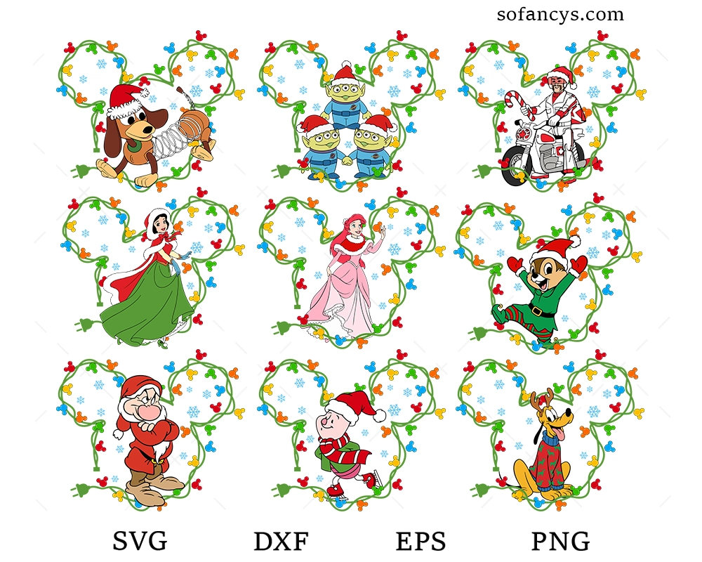 Sofancys presents the delightful Disney Christmas Lights SVG Bundle – Mickey Ears Holiday Design, featuring beloved characters like Mickey, Stitch, Belle, Tigger, Buzz Lightyear, and more. Each design showcases your favorite Disney icons surrounded by colorful Mickey-shaped Christmas lights, perfect for festive crafting. These high-quality SVG, DXF, EPS, and PNG files are ideal for Cricut and Silhouette projects, holiday shirts, mugs, cards, and decorations. Bring cheerful Disney magic to your Christmas creations with these adorable and vibrant designs that add sparkle and joy to every holiday craft idea.