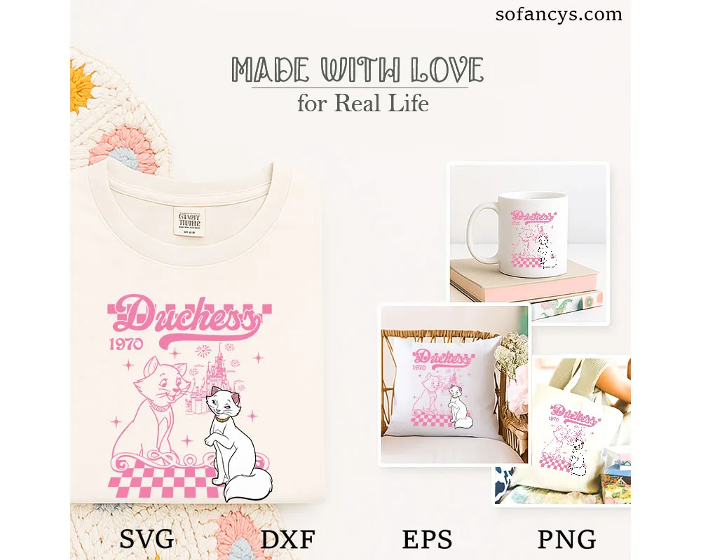 Sofancys presents a charming vintage-style kitten artwork featuring elegant lines, soft pink tones, and a fairytale castle backdrop. This Disney Duchess 1970 Cat SVG – Pink Princess Kitten Design highlights a graceful princess cat with classic retro lettering and decorative sparkles, perfect for shirts, decals, cards, and craft projects. Clean vector layers make it easy to cut and print with popular machines. A lovely choice for cute theme lovers, birthday gifts, and creative DIY collections.