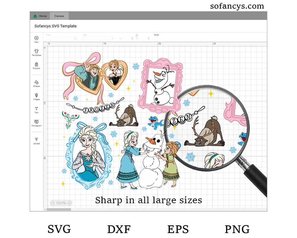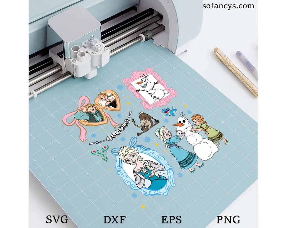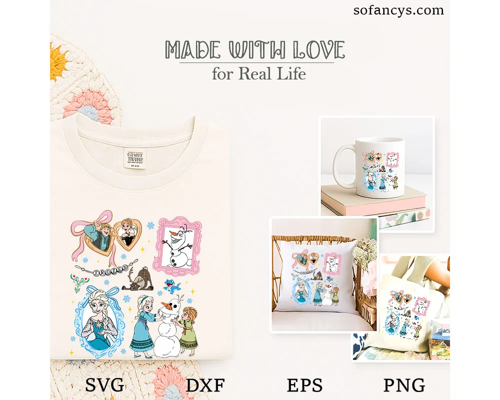 Sofancys introduces this Disney Frozen Characters SVG – Elsa Anna Olaf Bow Design, a magical design set featuring Elsa, Anna, Kristoff, Olaf, Sven, and Bruni in charming frames and playful poses. Highlighted with snowflakes, hearts, and decorative bows, this artwork captures the warmth of friendship and the wonder of Frozen’s winter magic. Perfect for Cricut and Silhouette projects, it’s ideal for shirts, mugs, tote bags, and seasonal décor. Bring the magic of Arendelle to your DIY crafts with this enchanting design that celebrates family, love, and the spirit of Frozen.