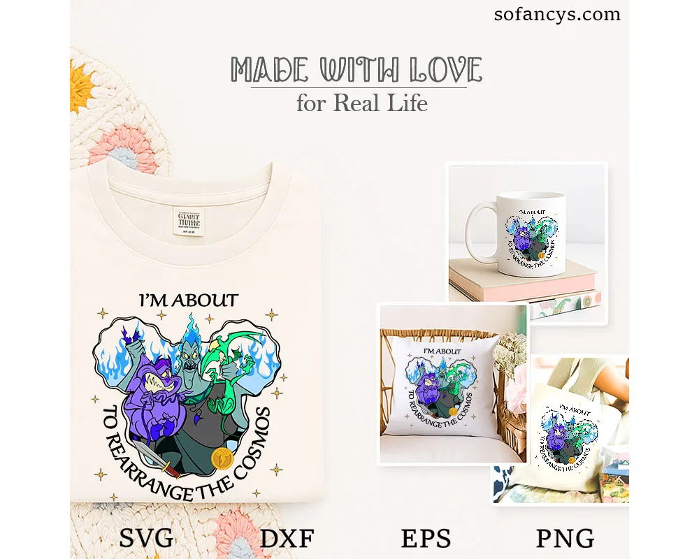 Sofancys introduces the Disney Hercules Hades SVG – Villain Rearrange the Cosmos File, a fiery and humorous design showcasing Hades with his mischievous minions Pain and Panic. Surrounded by blue flames and cosmic energy, this artwork captures the villain’s dramatic flair and godly power. Perfect for Cricut and Silhouette projects, it’s ideal for creating shirts, mugs, and gifts for fans who adore Disney’s iconic underworld ruler.