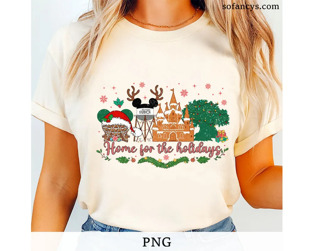 Sofancys presents a magical holiday artwork featuring Disney Holiday Parks PNG – Home for the Holidays Castle Design, capturing the warmth and charm of festive Disney traditions. The design showcases a gingerbread-style castle, Mickey ears with reindeer antlers, holiday lights, presents, and snowy Christmas elements that create a cozy seasonal atmosphere. Perfect for shirts, decorations, prints, and digital crafts, this artwork brings beloved Disney holiday park vibes to life in a whimsical and heartwarming way.