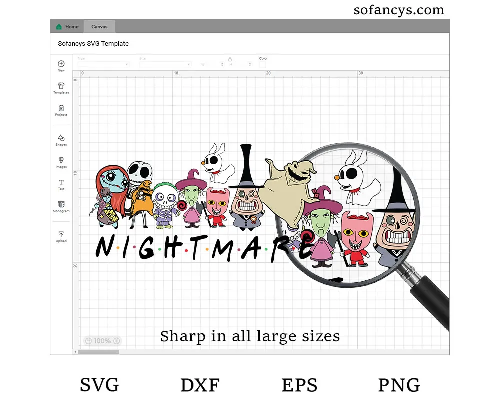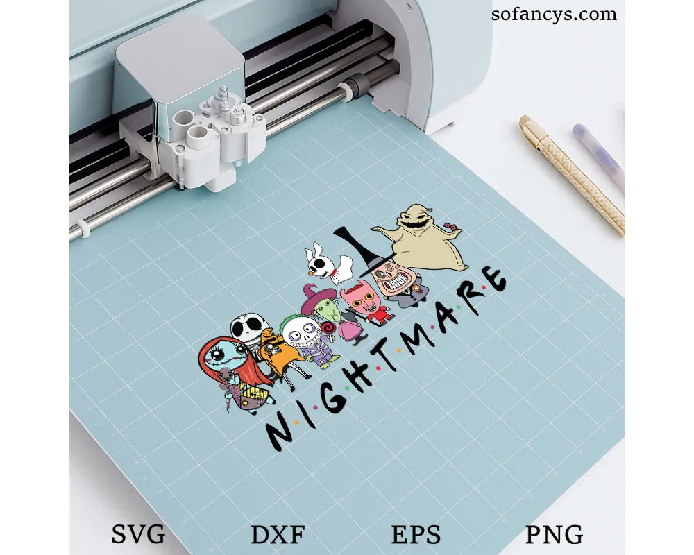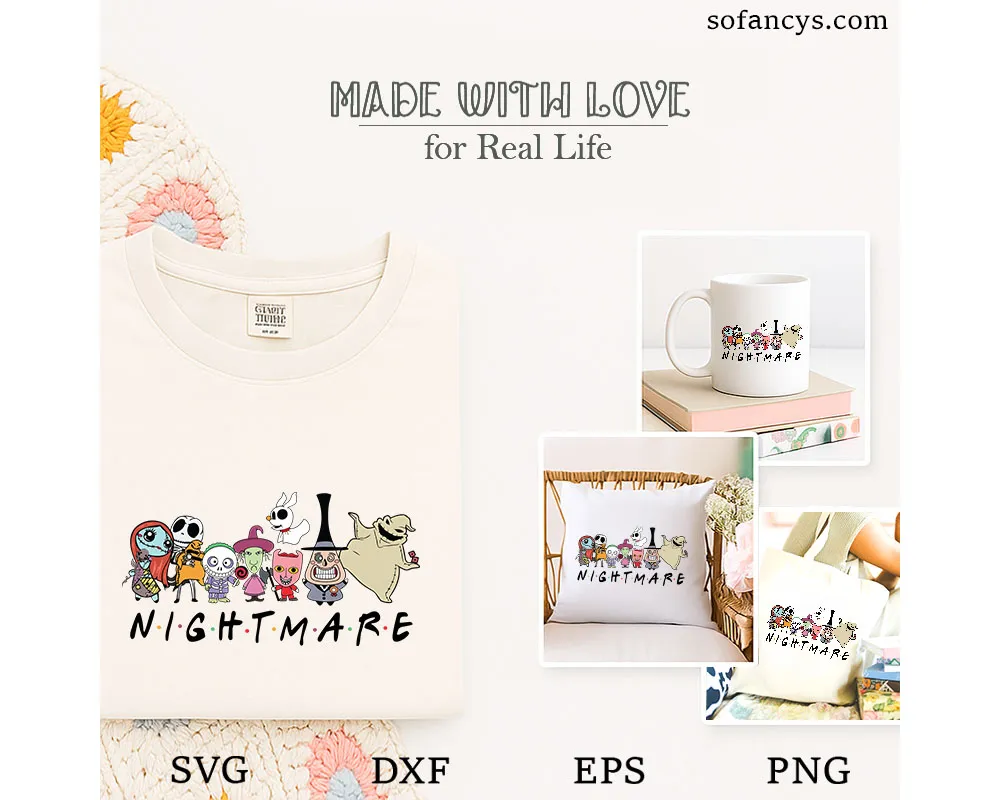 Sofancys presents the Disney Nightmare Friends SVG – Friends Jack Sally Design, a playful Halloween design featuring Jack, Sally, Oogie Boogie, and friends in a cute cartoon style. The word “Nightmare” below ties them together in a spooky yet fun theme. Perfect for shirts, mugs, and DIY crafts with Cricut or Silhouette.