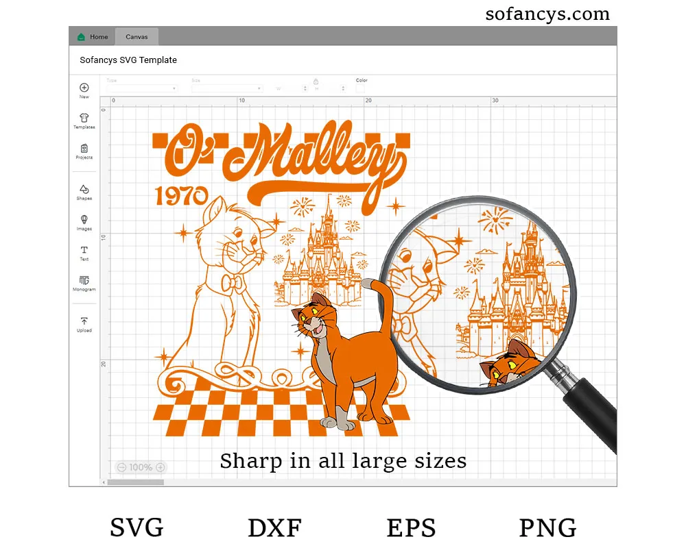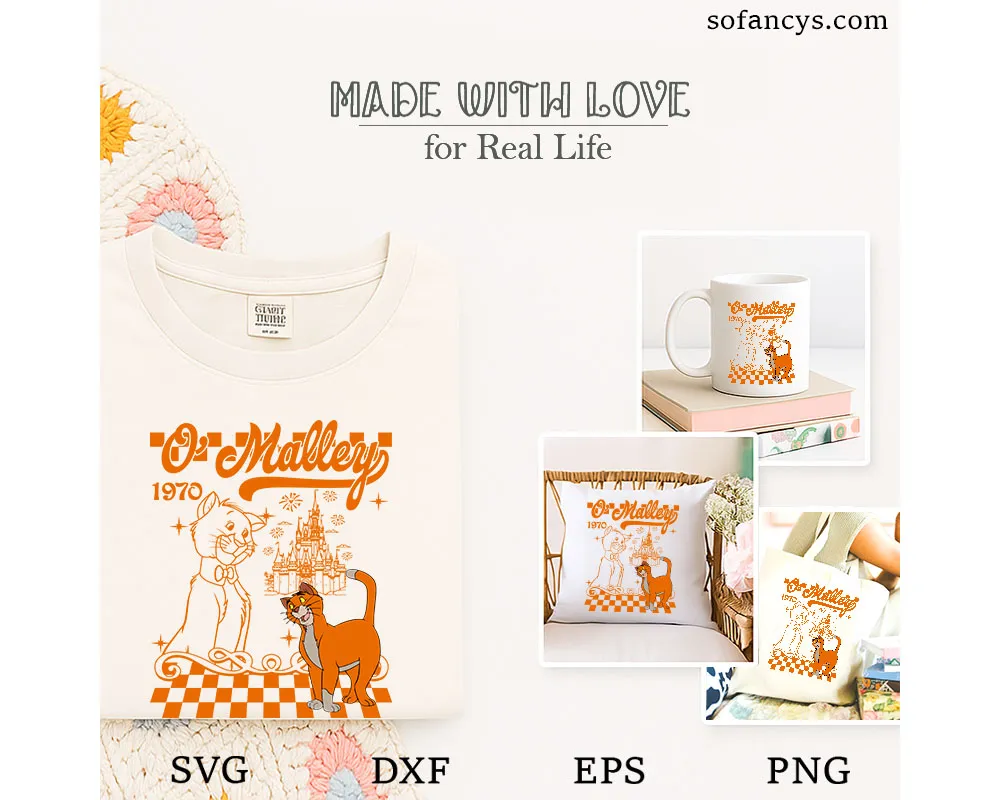 Sofancys introduces a bold retro kitten artwork featuring a confident orange alley cat with vintage lettering and a fairytale castle backdrop. This Disney O’Malley 1970 Cat SVG – Orange Alley Cat Castle Design blends classic animation style with clean vector structure, making it ideal for shirts, decals, stickers, and DIY craft projects. Smooth linework and layered elements support easy cutting and printing with Cricut or Silhouette machines. A fun choice for cartoon cat fans and nostalgic design lovers.
