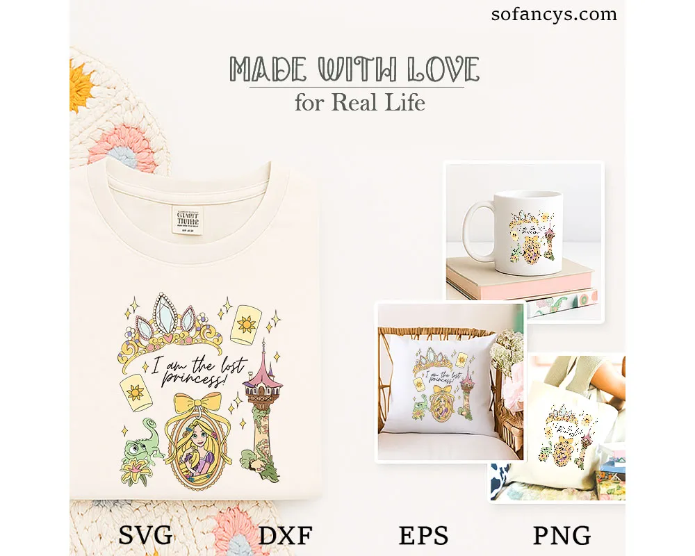 Sofancys introduces the magical Disney Tangled Rapunzel SVG – Lost Princess Tower Design, featuring Rapunzel, her crown, lanterns, Pascal, and iconic tower for creative projects.