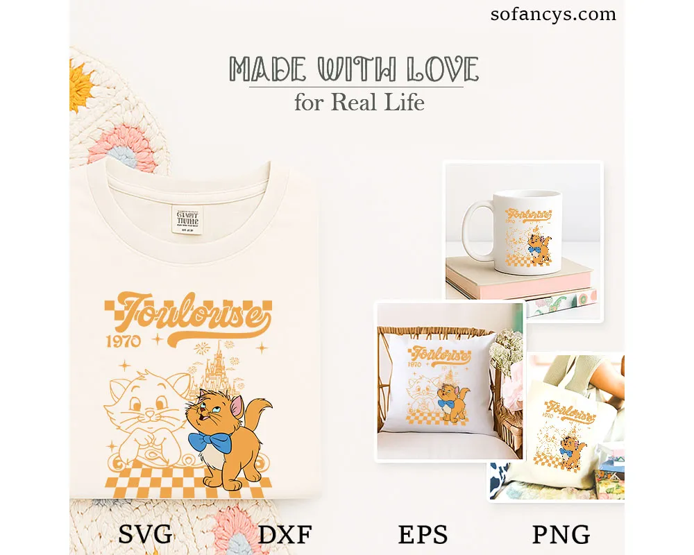 Sofancys introduces a cheerful vintage kitten artwork featuring a playful orange cat with a bow tie, retro 1970 typography, and a fairytale castle backdrop. This Disney Toulouse 1970 Cat SVG – Orange Kitten Castle Design is crafted for crafters who love cute classic cartoon style and clean cut-ready layouts.