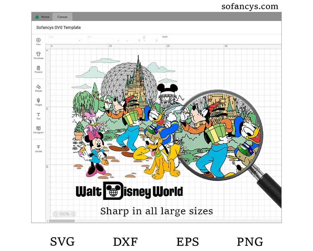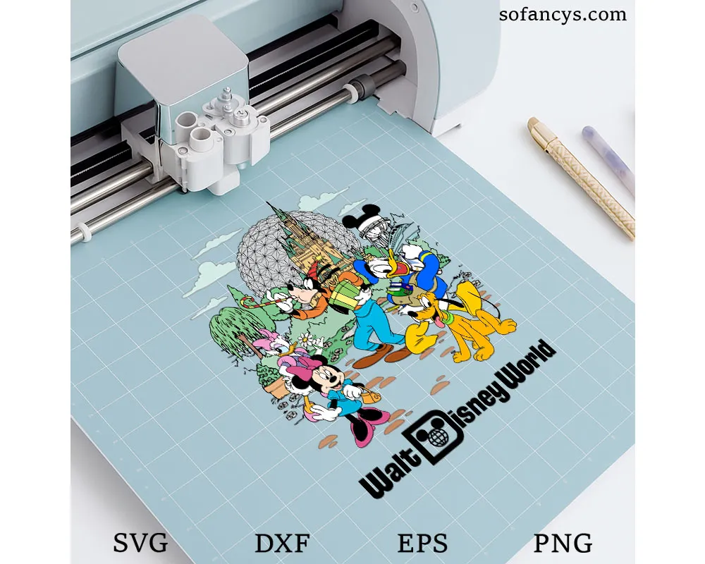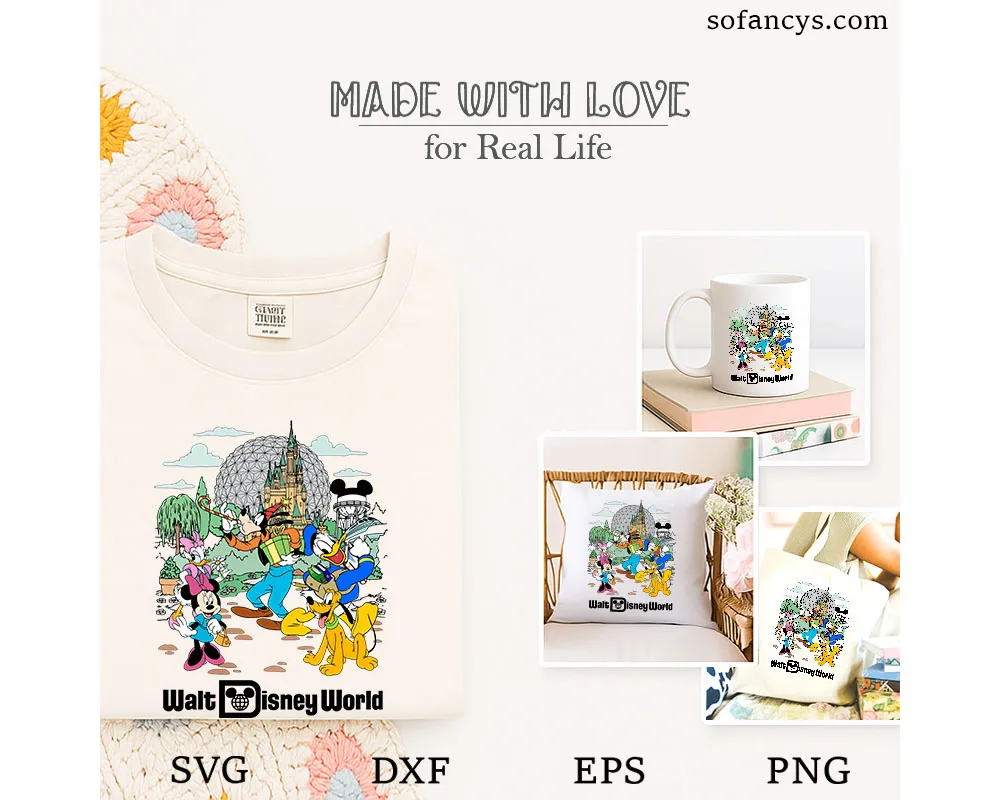 Sofancys presents the Disney World Trip SVG – Mickey and Friends Castle Clipart, a delightful design capturing the magic of Walt Disney World with Mickey, Minnie, Goofy, Donald, Daisy, and Pluto enjoying their park adventure. Set against the iconic castle and Epcot sphere, this vibrant artwork celebrates the joy of Disney vacations and family fun. Perfect for matching shirts, travel keepsakes, mugs, or tote bags, this high-quality SVG is compatible with Cricut and Silhouette machines. Bring the wonder of Disney parks to your next project with this cheerful and nostalgic design!