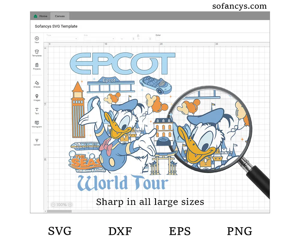Please note that you’re just purchasing a digital design titled “Donald Duck EPCOT World Tour Digital File”. In other words, this is not a physical product that will be shipped to your home. All files will be delivered digitally for instant download.