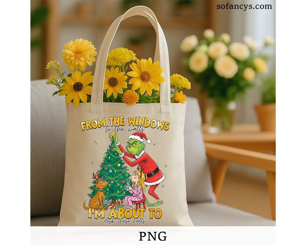 Sofancys presents this playful Funny Grinch Christmas PNG – I’m About To Deck These Halls File, capturing a humorous holiday moment filled with charm and mischief. The design features the Grinch in a Santa suit reaching to place a star on the Christmas tree, while a sweet little girl and a happy reindeer pup watch in delight. Surrounded by twinkling ornaments, gifts, and festive colors, this artwork blends comedy with Christmas magic. Perfect for shirts, mugs, posters, and holiday crafts, it brings a fun twist to seasonal celebrations and adds a joyful, lighthearted spirit to any project.