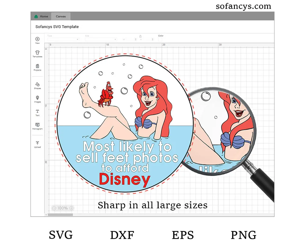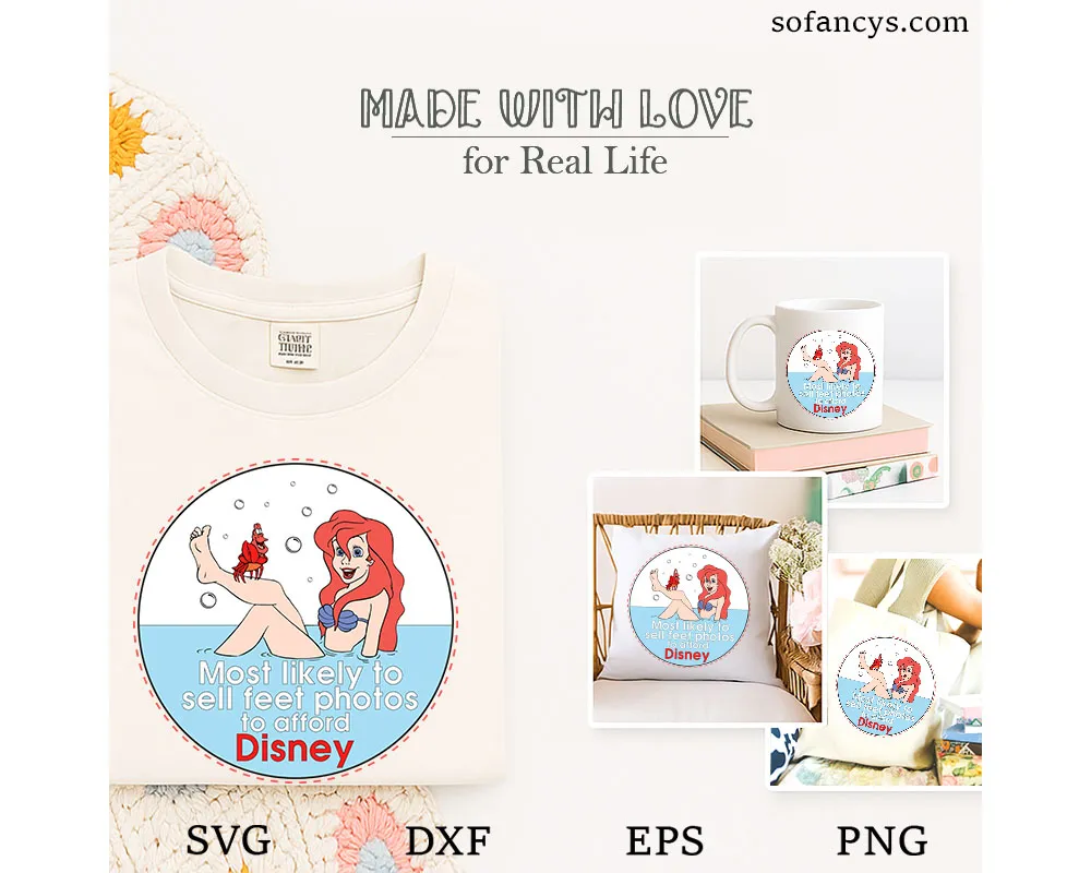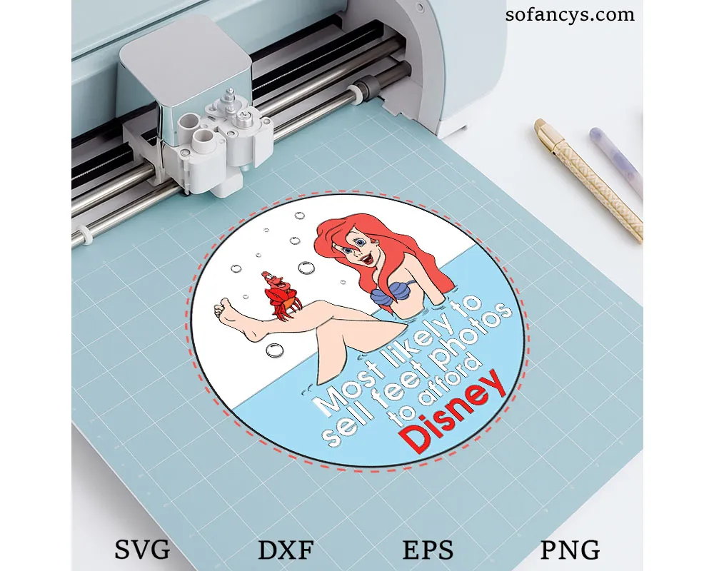 Sofancys presents the Funny Mermaid Disney Trip SVG – Most Likely To Afford Disney, a playful and humorous design perfect for Disney lovers with a sense of sarcasm. The artwork features a cheerful mermaid relaxing in the water with her crab friend while a funny caption adds a bold and witty twist. Surrounded by bubbles and a clean circular frame, this design captures vacation humor with a magical theme park vibe. Perfect for Cricut projects, shirts, stickers, tumblers, and travel outfits, this SVG design is great for funny Disney trip crafts.