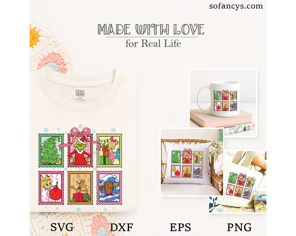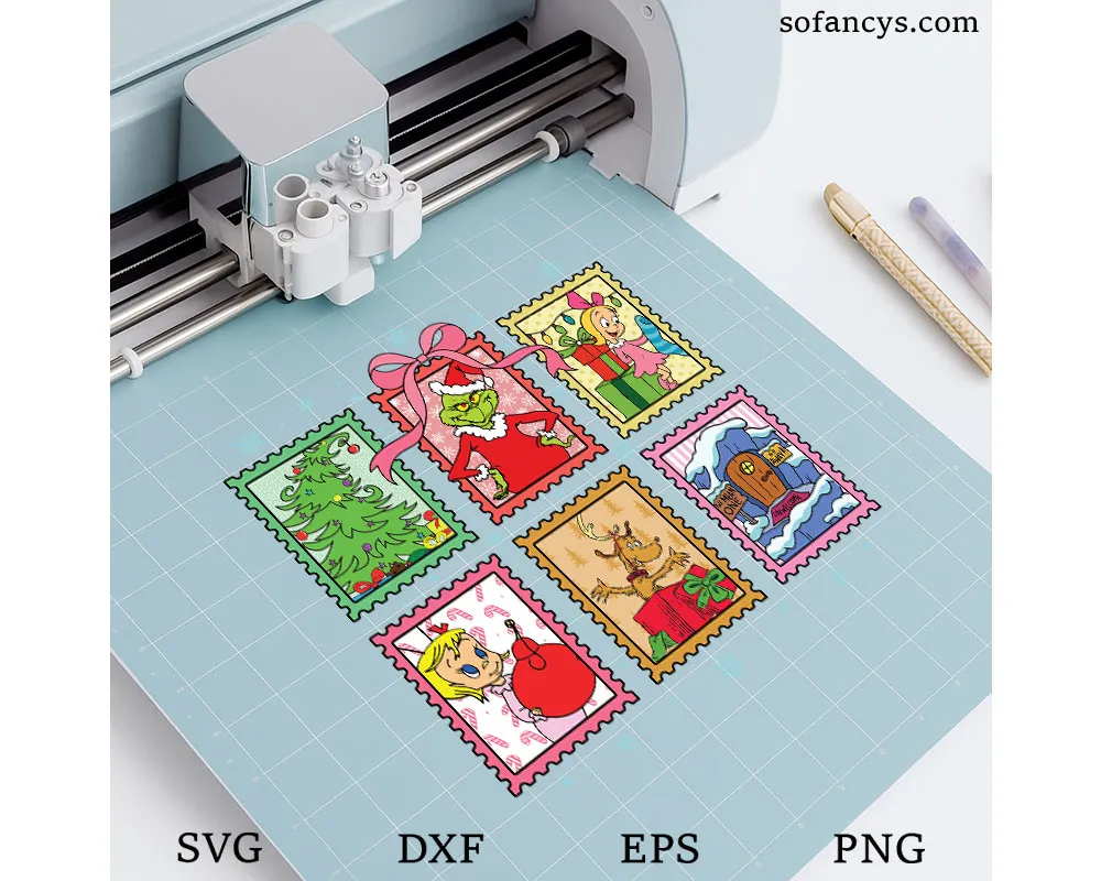 Sofancys presents the Grinch Christmas Stamps SVG – Retro Holiday Postcard Design, a charming holiday collection featuring six festive stamp-style designs inspired by the classic story. Each stamp showcases beloved scenes of the Grinch, Max, and Cindy Lou Who surrounded by gifts, lights, and snowy details. Perfect for Christmas cards, mugs, stickers, or Cricut crafts full of Whoville cheer!
