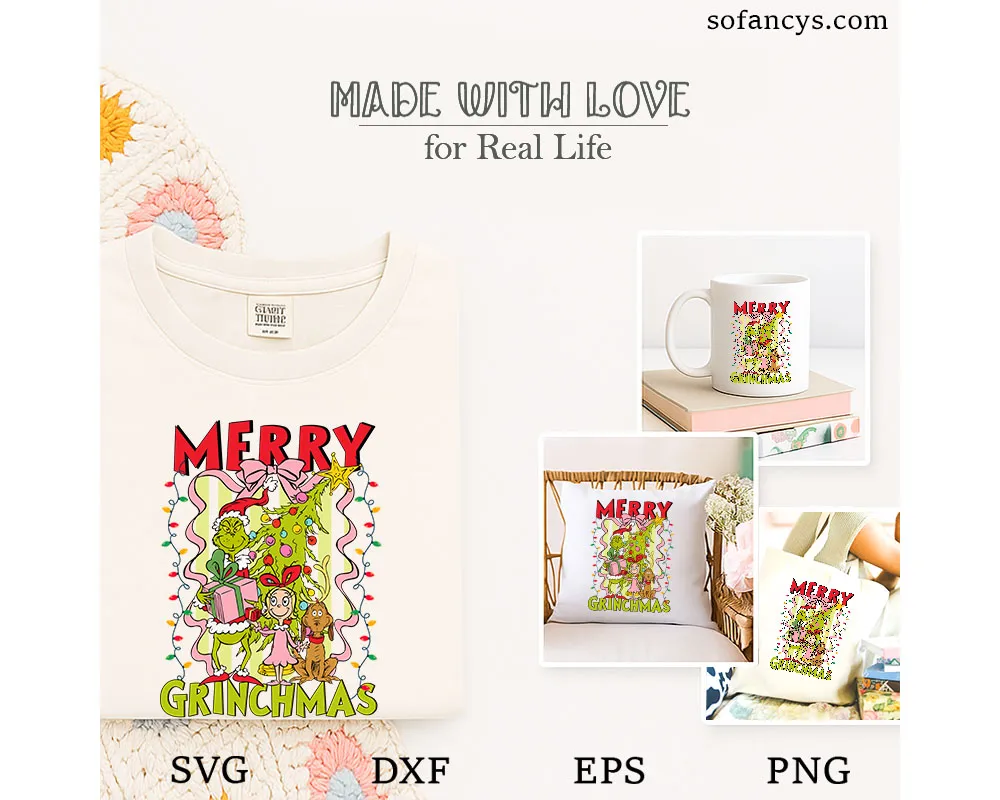 Sofancys brings festive warmth to your holiday crafts with this charming family-style Christmas artwork. Featuring the Grinch, Cindy Lou, and Max gathered around a decorated tree, this design captures togetherness, joy, and classic Whoville spirit. The playful characters, bright ornaments, and cozy holiday details make it perfect for shirts, sweatshirts, mugs, stickers, and seasonal décor. Ideal for Cricut and Silhouette projects, this artwork adds a nostalgic Christmas vibe to handmade gifts and winter creations using Grinch Family Christmas SVG – Grinch Cindy Lou Max Holiday Art.