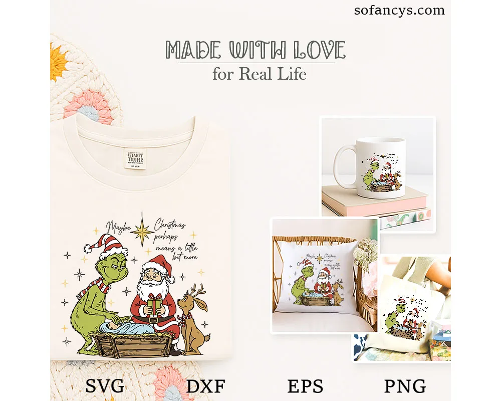Sofancys introduces a heart-touching Grinch Santa Nativity SVG – Christmas Faith Manger Design that beautifully blends humor and meaning in a festive Christmas scene. The artwork features the Grinch, Santa Claus, a baby in a manger, and a sweet reindeer, all surrounded by warm golden stars and the quote “Maybe Christmas perhaps means a little bit more.” This charming illustration celebrates joy, kindness, and the true spirit of the season. Perfect for shirts, mugs, ornaments, and holiday décor, it adds a playful yet meaningful touch to your Christmas crafting projects.
