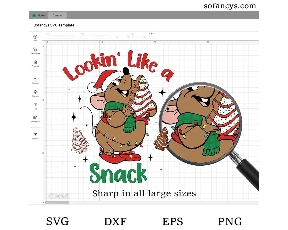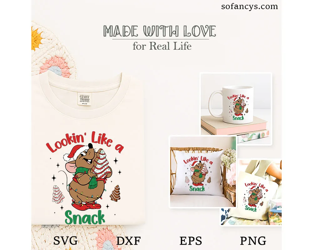 Sofancys presents a charming holiday illustration featuring Gus Gus Christmas SVG – Funny Mouse Snack Holiday File, a delightfully festive design perfect for seasonal crafting. The artwork showcases Gus Gus dressed in a cozy scarf, Santa hat, and twinkling lights while happily hugging a stack of Christmas tree treats. Surrounded by sparkling stars and adorable snack graphics, this cute and playful style brings warmth and humor to your Christmas projects. Ideal for shirts, mugs, decals, cards, and more, this joyful design adds a fun and whimsical touch to any holiday creation.