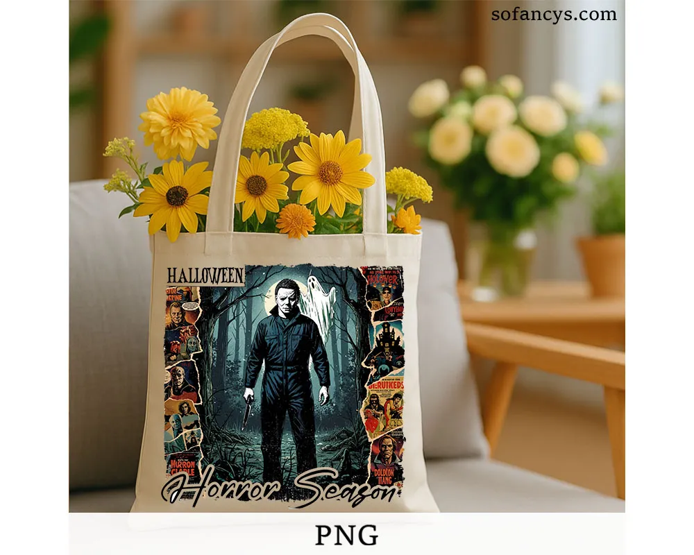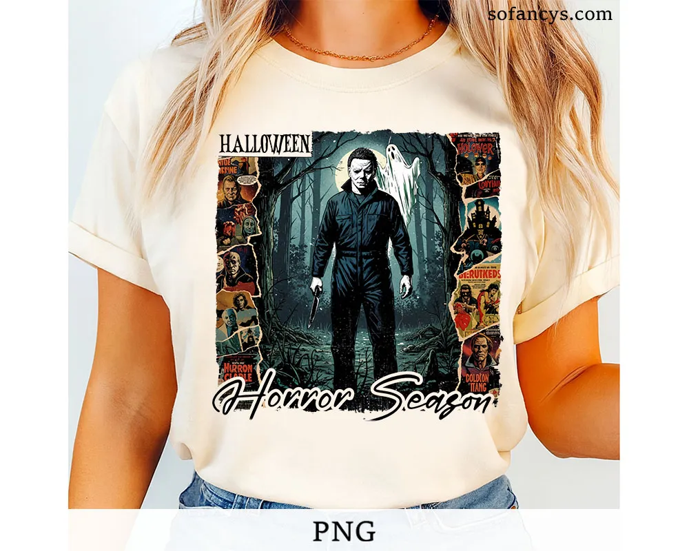 Sofancys presents the Halloween Horror Season PNG – Michael Myers Movie Art, a chilling design featuring an eerie forest backdrop, a masked figure, and vintage horror movie posters. This dark, atmospheric artwork perfectly captures the spooky essence of Halloween, making it ideal for horror-themed crafts, apparel, or decor. The Halloween Horror Season PNG blends classic fright with retro cinematic style — perfect for true fans of the horror season.