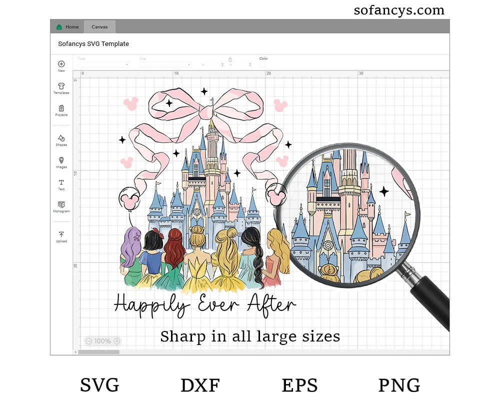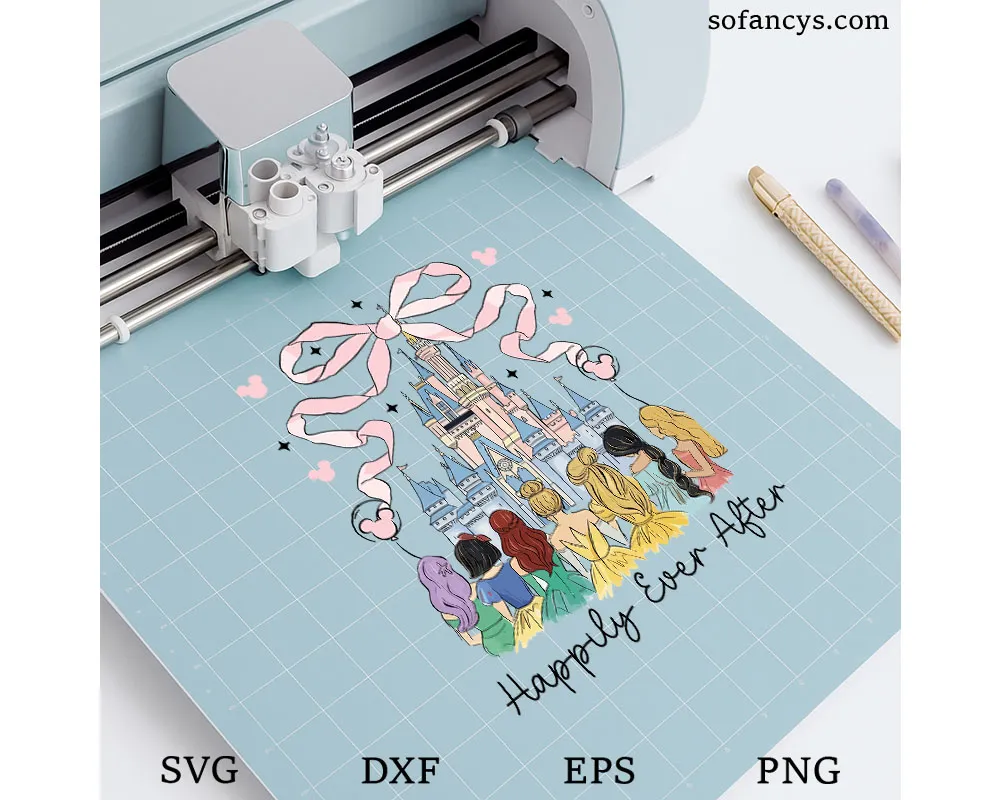 Sofancys presents a dreamy fairytale artwork featuring a magical castle, ribbon bow, and a girl squad of princess silhouettes gathered together in a soft pastel style. This Happily Ever After Princess Castle SVG – Fairytale Girl Squad File is perfect for crafting shirts, party decor, tote bags, and scrapbook projects. The layout is clean, charming, and print-friendly, designed for smooth cutting and vibrant results across multiple DIY and digital crafting uses.