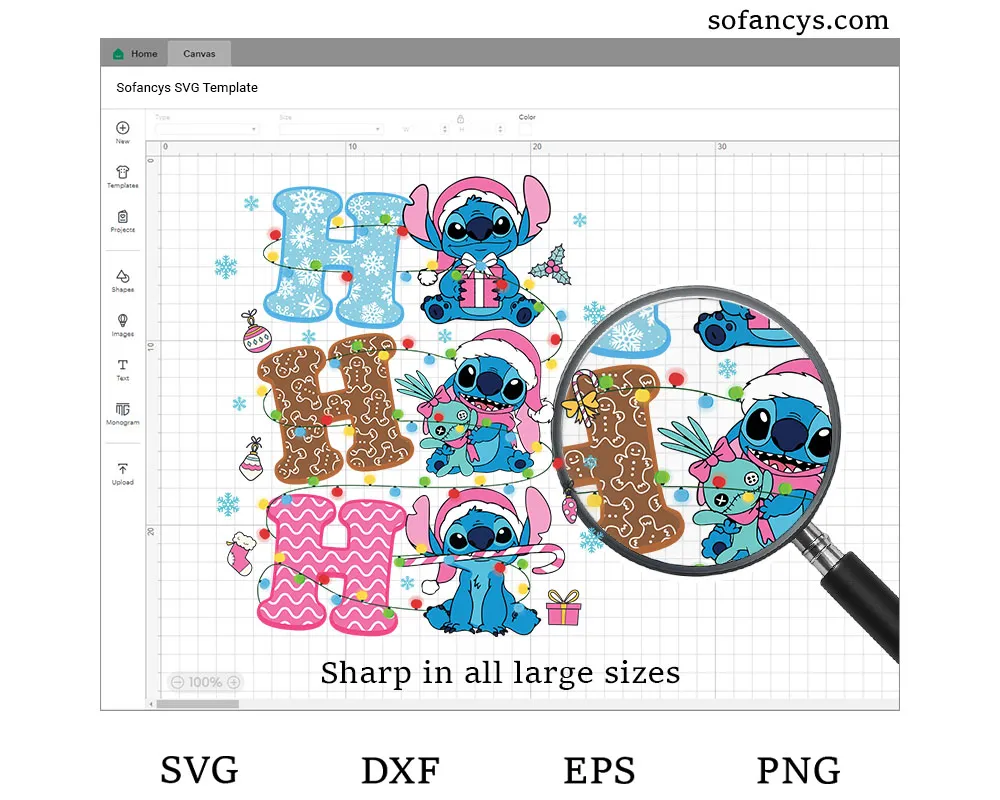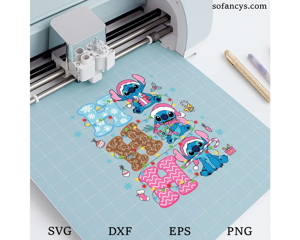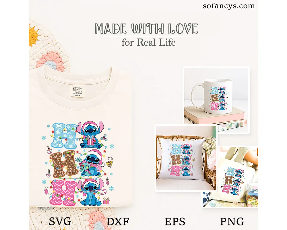 Sofancys presents a joyful Ho Ho Ho Stitch Christmas SVG – Cute Holiday Lights File, featuring three playful Stitches sitting beside festive letters decorated in snowflakes, gingerbread patterns, and pink holiday swirls. Each Stitch wears a Santa hat and holds adorable Christmas props like a gift box, a plush toy, and a candy cane, while colorful string lights wrap around the entire design. Perfect for shirts, mugs, ornaments, and holiday crafts, this cheerful artwork brings a bright and whimsical Christmas spirit to any project.