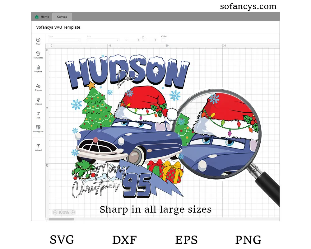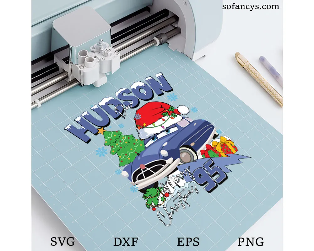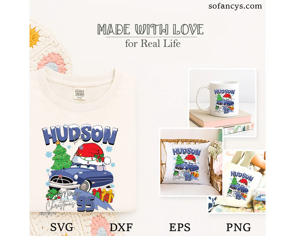 Sofancys introduces the Hudson Cars Christmas SVG – Cute Xmas 95 Holiday Design File, a festive and charming holiday design featuring Hudson adorned with a Santa hat, Christmas lights, and surrounded by snowflakes, gifts, and a decorated tree. The bold icy “HUDSON” lettering and the signature “95” detail bring a fun seasonal twist inspired by the Cars universe. Perfect for Christmas shirts, kids’ crafts, party décor, and personalized gifts, this joyful artwork adds holiday cheer to every project. A delightful and spirited design that captures the magic of Christmas in true Cars style.