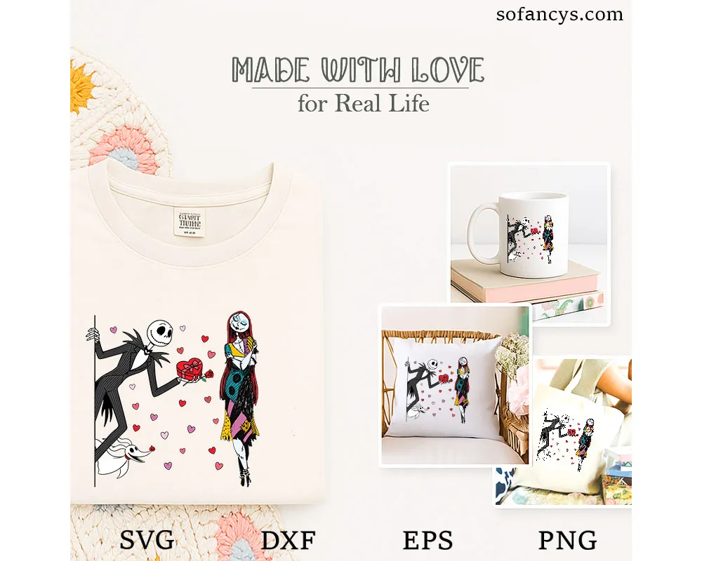 Sofancys introduces a romantic gothic illustration inspired by timeless spooky love. Jack And Sally Valentine SVG – Gothic Love Cartoon Design shows Jack offering a heart-shaped gift to Sally while floating hearts create a dreamy atmosphere. Moreover, the bold lines and expressive characters deliver strong emotional impact. In addition, the detailed yet clean vector style ensures smooth cutting and printing. Therefore, this design works perfectly for Valentine shirts, stickers, wall art, and creative horror-themed craft projects.