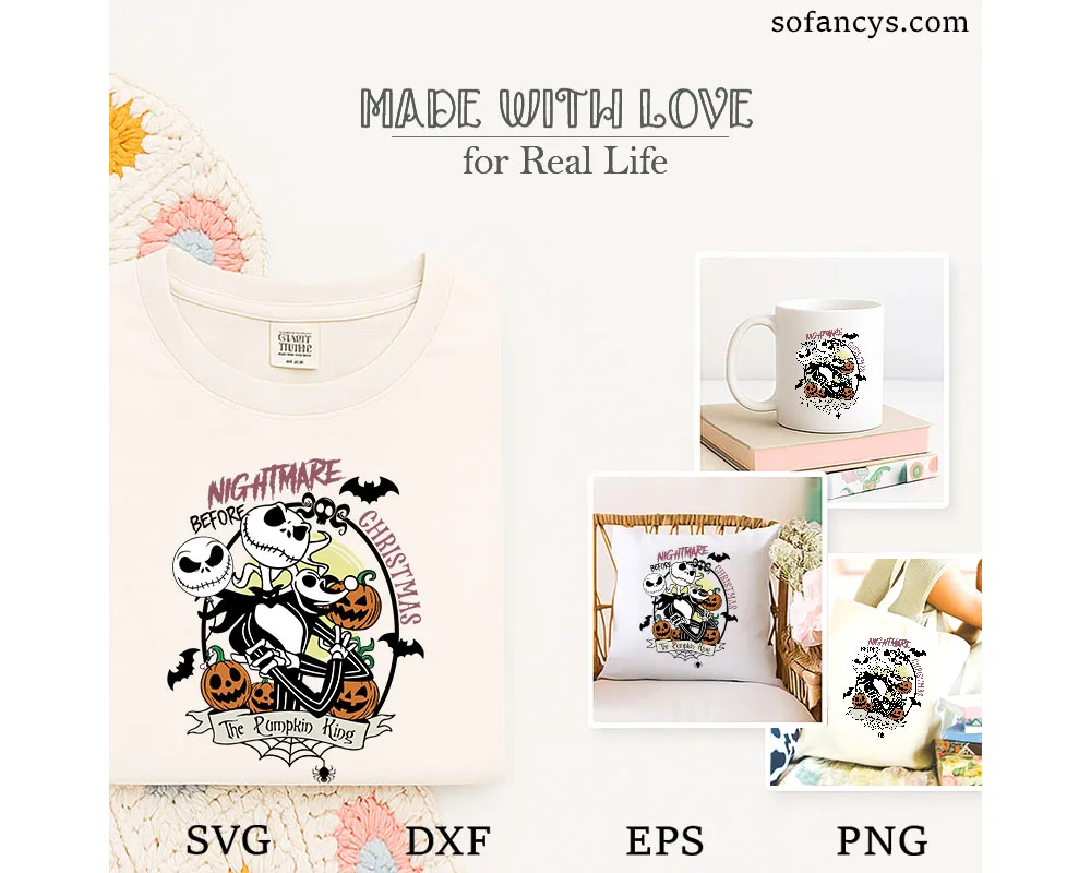 Sofancys introduces the Jack Skellington Pumpkin King SVG – Nightmare Before Christmas, a spooky design inspired by The Nightmare Before Christmas. Featuring Jack Skellington holding pumpkins with bats, skulls, and spider webs around him, this artwork captures the dark yet whimsical charm of Halloween and Christmas. The banner reading “The Pumpkin King” highlights his iconic role. Perfect for Cricut and Silhouette projects, this SVG works well for shirts, mugs, home décor, and holiday crafts, bringing gothic Disney magic to your creative ideas and seasonal designs.