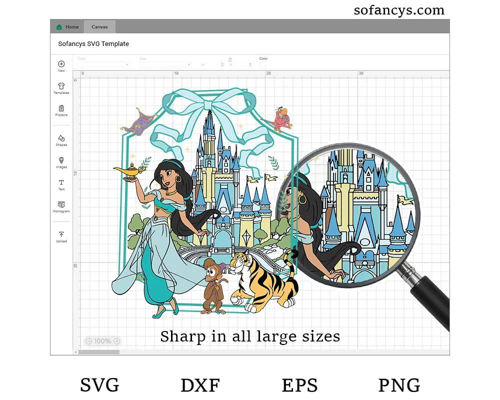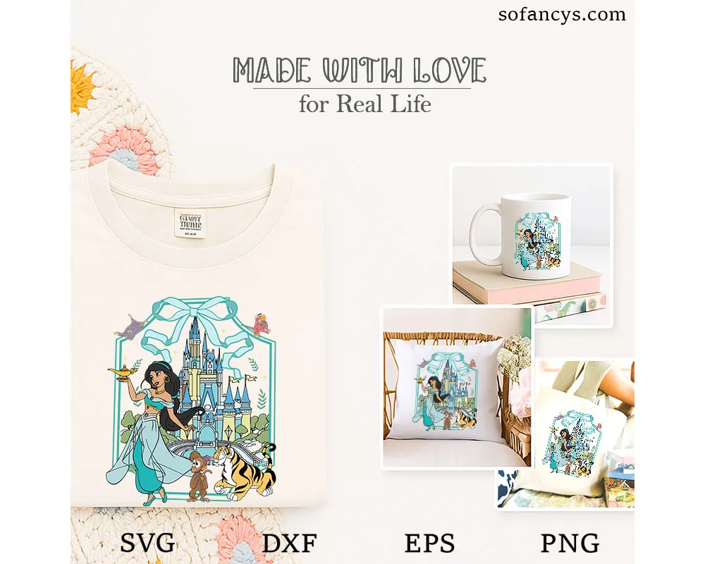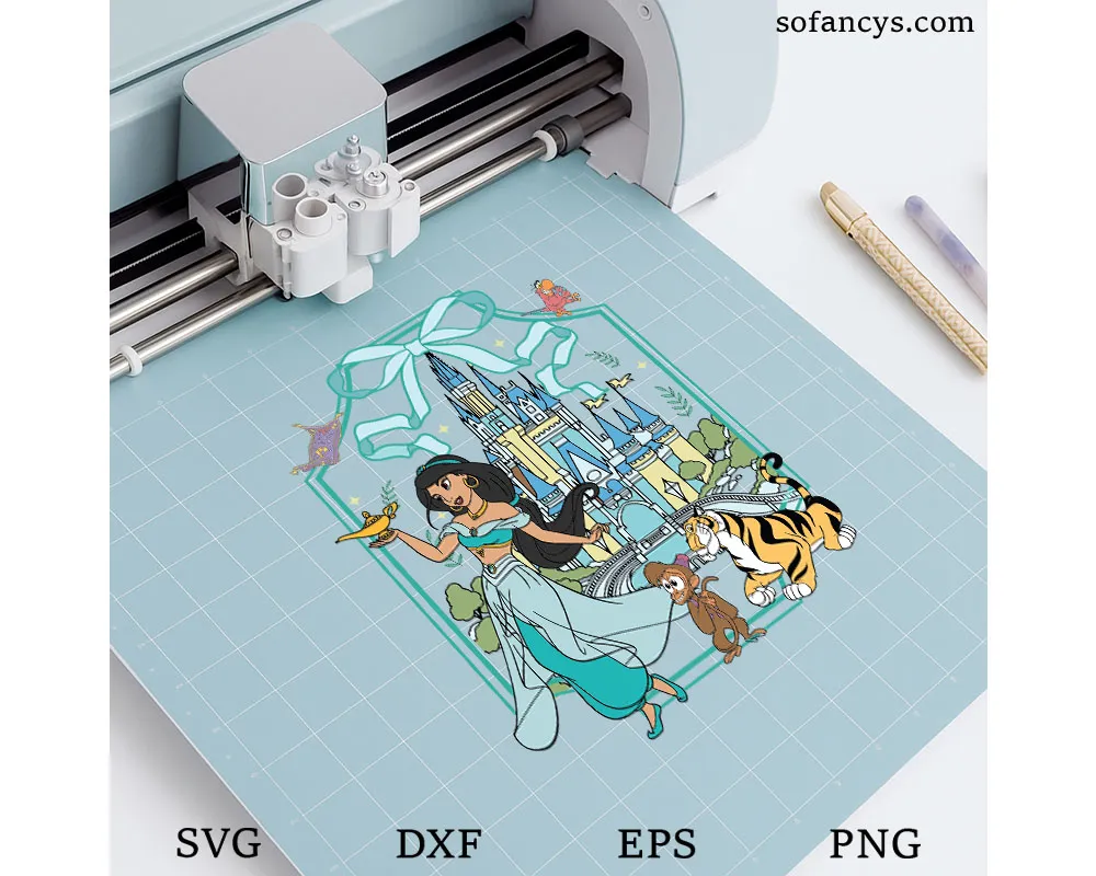 Sofancys presents the Jasmine Coquette Bow Castle SVG – Magical Princess Design, a stunning fairytale illustration inspired by royal adventure and magic. The design features an elegant princess holding a magical lamp while standing gracefully before a whimsical castle decorated with a charming coquette bow. Playful companions and enchanting story elements add lively details, creating a dreamy princess aesthetic. With soft pastel colors and intricate artwork, this design is perfect for Cricut projects, sublimation prints, shirts, stickers, and handmade crafts, capturing the spirit of magic, royalty, and timeless fairytale wonder.