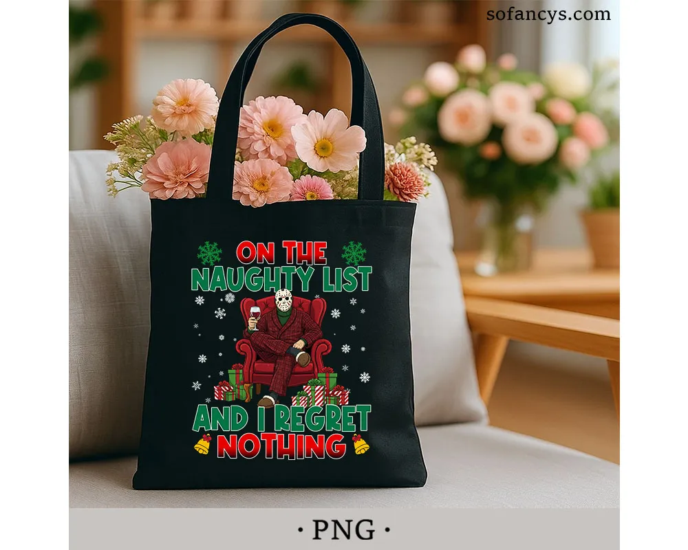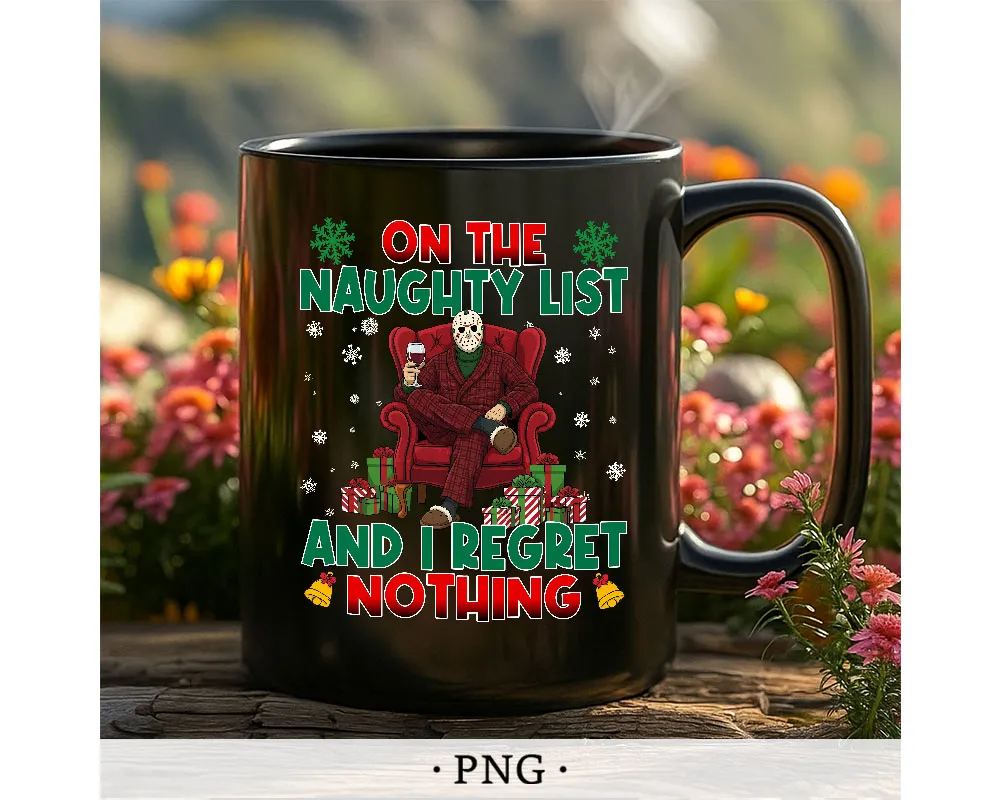 Sofancys presents a bold and edgy Jason Naughty List PNG – Funny Christmas Pajama Horror Art design that mixes dark humor with Christmas spirit. The artwork features the masked character relaxing casually in a red armchair, dressed in holiday pajamas, holding a glass of wine, and surrounded by piles of wrapped gifts and falling snowflakes. The scene delivers a playful yet intimidating vibe, perfect for those who embrace the naughty side of the holidays. The striking red and green phrase “On the Naughty List and I Regret Nothing” adds the ultimate sarcastic twist. Ideal for shirts, sweaters, mugs, posters, décor, and DIY Christmas crafting projects.