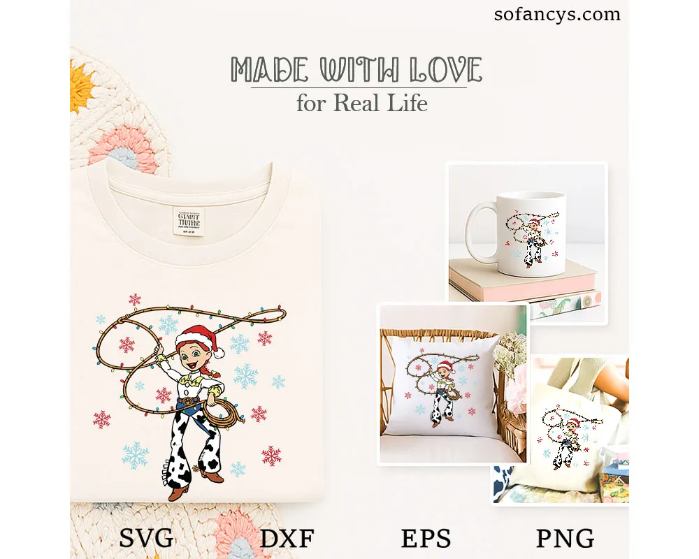 Sofancys presents the Jessie Cowgirl Xmas SVG – Toy Story Santa Lights Christmas File, a joyful Toy Story Christmas design featuring Jessie in her cowgirl outfit, Santa hat, and twinkling holiday lights wrapped around her lasso. Surrounded by colorful snowflakes, this festive artwork adds western cheer to your Christmas crafts. Perfect for Cricut and Silhouette users creating shirts, mugs, or seasonal décor full of Toy Story spirit!