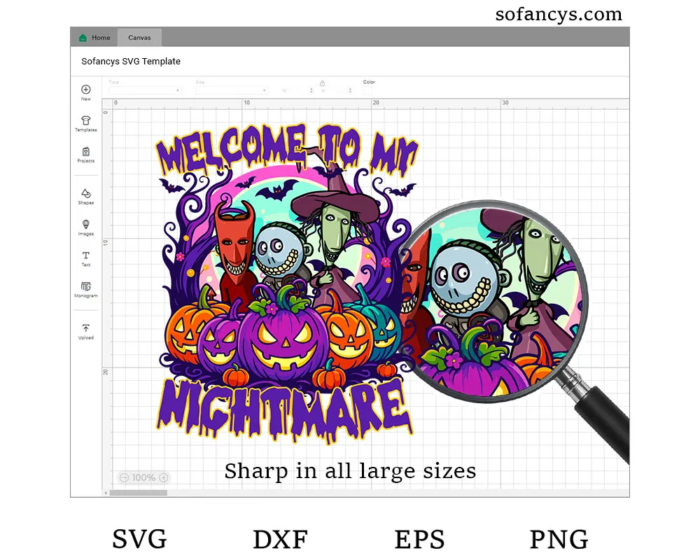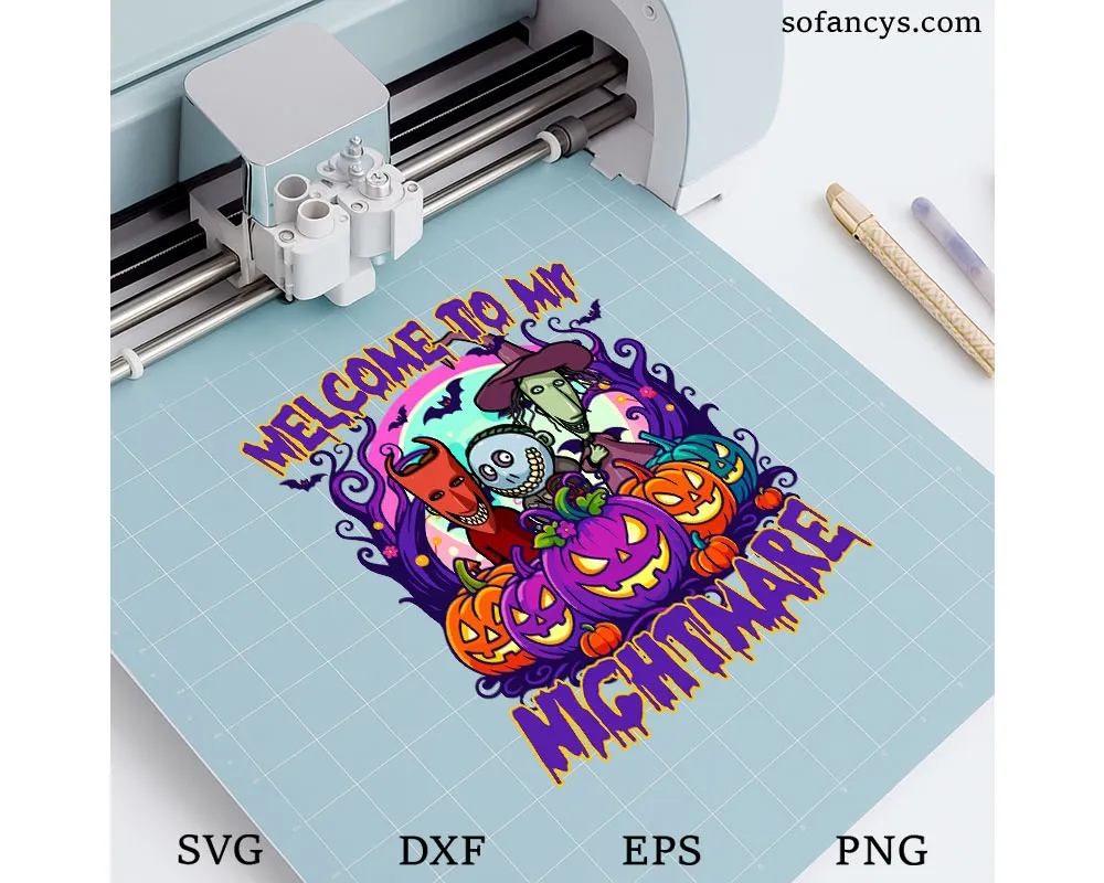 Sofancys introduces the vibrant Lock Shock Barrel SVG – Welcome To My Nightmare Design, a spooky and playful Halloween design inspired by classic nightmare characters. Featuring colorful pumpkins, eerie bats, and twisted vines, this artwork captures the mischief of the trio perfectly. Ideal for shirts, mugs, and Halloween decor crafts!