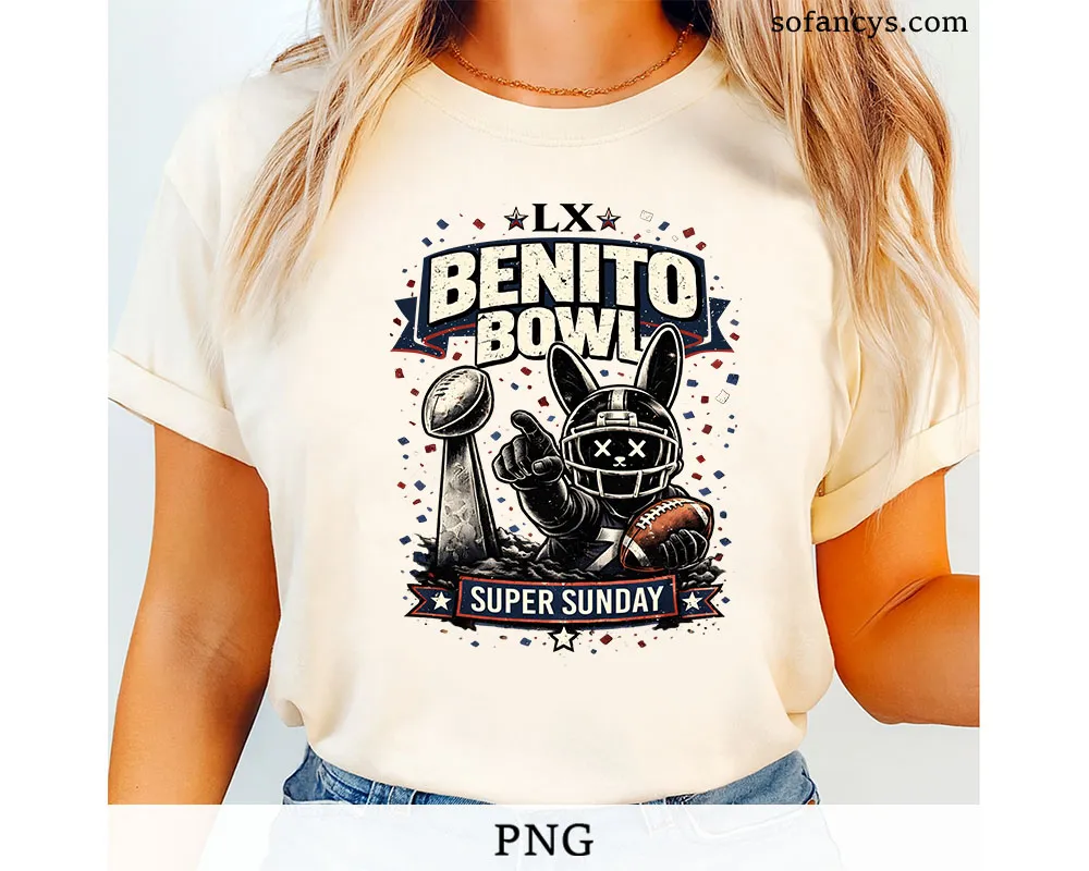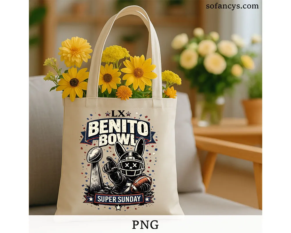 Sofancys presents a bold sports graphic featuring LX Benito Bowl Super Sunday PNG – Football Mascot Trophy File, designed with a fierce mascot in a helmet, championship trophy, and dynamic game-day elements. The layout blends vintage texture with modern contrast, making it ideal for t-shirts, posters, stickers, and fan merch. High-resolution details and balanced colors help the design print cleanly across materials, giving creators a strong, energetic football theme ready for instant digital use.