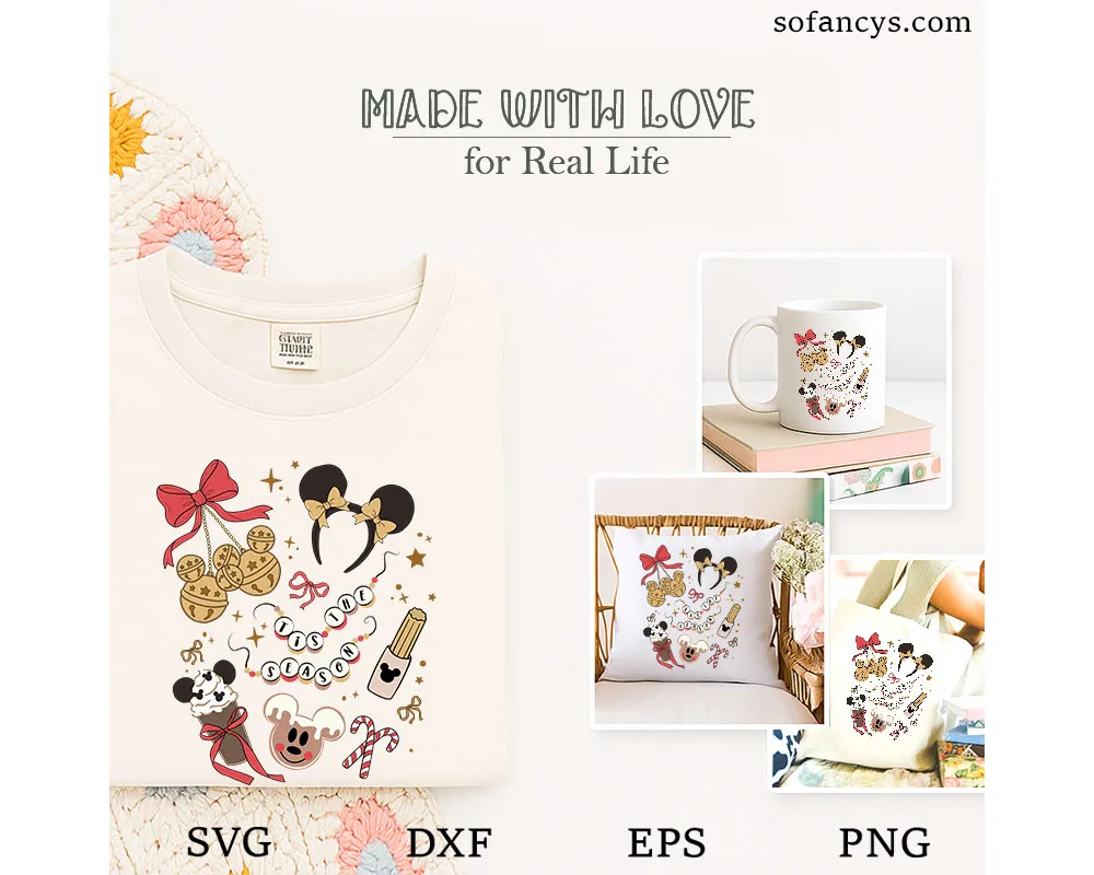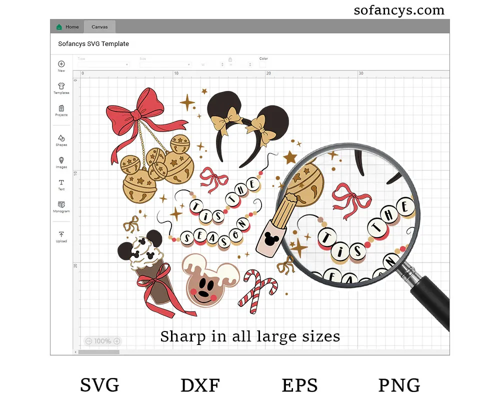 Sofancys presents the Magical Mickey Minnie Christmas SVG – Gingerbread Holiday File, a festive and elegant design featuring Mickey-shaped treats, bows, bells, and candy canes. With golden tones, red ribbons, and sparkling stars, this artwork captures the magic of Disney Christmas. Perfect for Cricut and Silhouette projects like shirts, mugs, and holiday decorations celebrating cheerful Disney spirit!