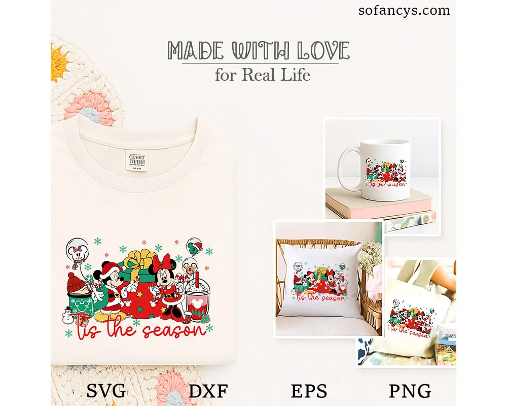 Sofancys presents the Mickey and Minnie Xmas SVG – Santa Holiday Hot Cocoa Design, a delightful Christmas design featuring Mickey and Minnie dressed in Santa outfits surrounded by gifts, candy canes, snowflakes, and festive treats. This adorable holiday artwork captures the joyful Disney spirit, perfect for Cricut and Silhouette projects like shirts, mugs, cards, and Christmas decorations full of cheer and love!