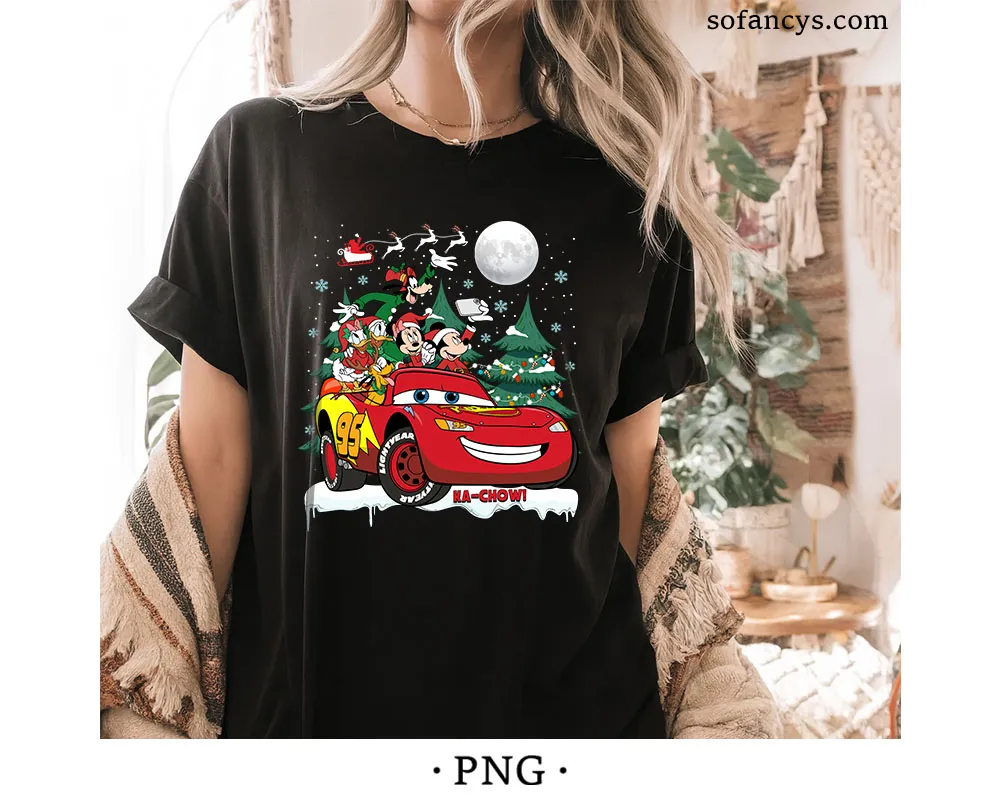 Sofancys presents a joyful holiday artwork featuring Mickey Friends Cars Christmas SVG – Lightning McQueen Design, where Mickey, Minnie, Donald, Daisy, and Goofy ride together atop Lightning McQueen in a festive winter scene. Wrapped in Christmas lights, surrounded by snowy trees, and illuminated by a full moon, this cheerful design brings Disney magic to the holiday season. Perfect for shirts, crafts, and decorations.