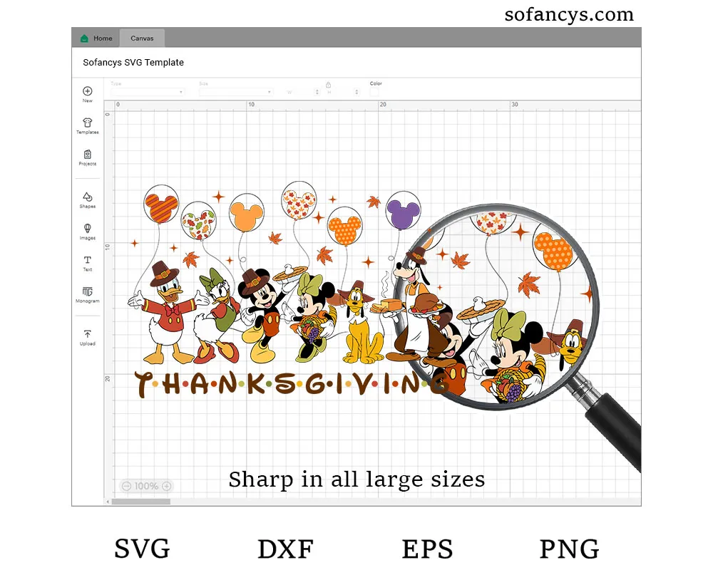Please note that you’re just purchasing a digital design titled “Mickey Friends Thanksgiving Digital File”. In other words, this is not a physical product that will be shipped to your home. All files will be delivered digitally for instant download.