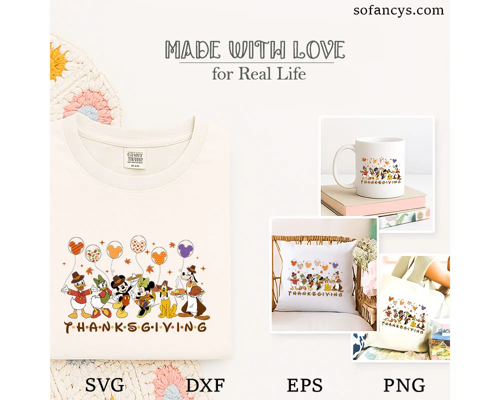 Sofancys introduces this cheerful Mickey Friends Thanksgiving SVG – Cute Fall Dinner Cartoon File, a festive design filled with autumn warmth and holiday joy. The artwork showcases a charming parade of beloved characters dressed in Thanksgiving outfits, each holding themed balloons shaped with cute seasonal patterns. Surrounded by falling leaves and cozy harvest colors, the scene highlights friendship, gratitude, and celebration. Perfect for shirts, invitations, décor, and craft projects, this design brings a playful and heartwarming Thanksgiving spirit to all your creative ideas.