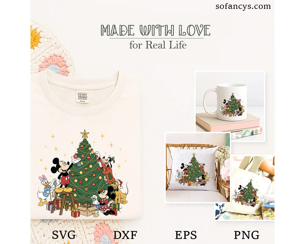 Sofancys introduces the Mickey Minnie Christmas Tree SVG – Disney Holiday Decor File, a heartwarming holiday design featuring the beloved Disney friends decorating a sparkling Christmas tree together. Mickey, Minnie, Goofy, Daisy, and Pluto join in the festive fun, hanging ornaments, sharing smiles, and surrounding the tree with colorful presents. Glowing stars add extra Christmas magic, making this artwork perfect for holiday shirts, décor, party crafts, and personalized gifts. With its joyful scene and classic character charm, this design brings warm Christmas spirit to any creative project.