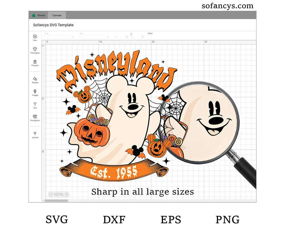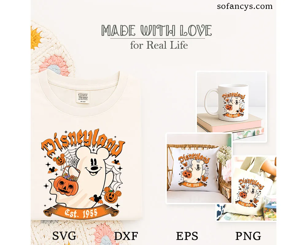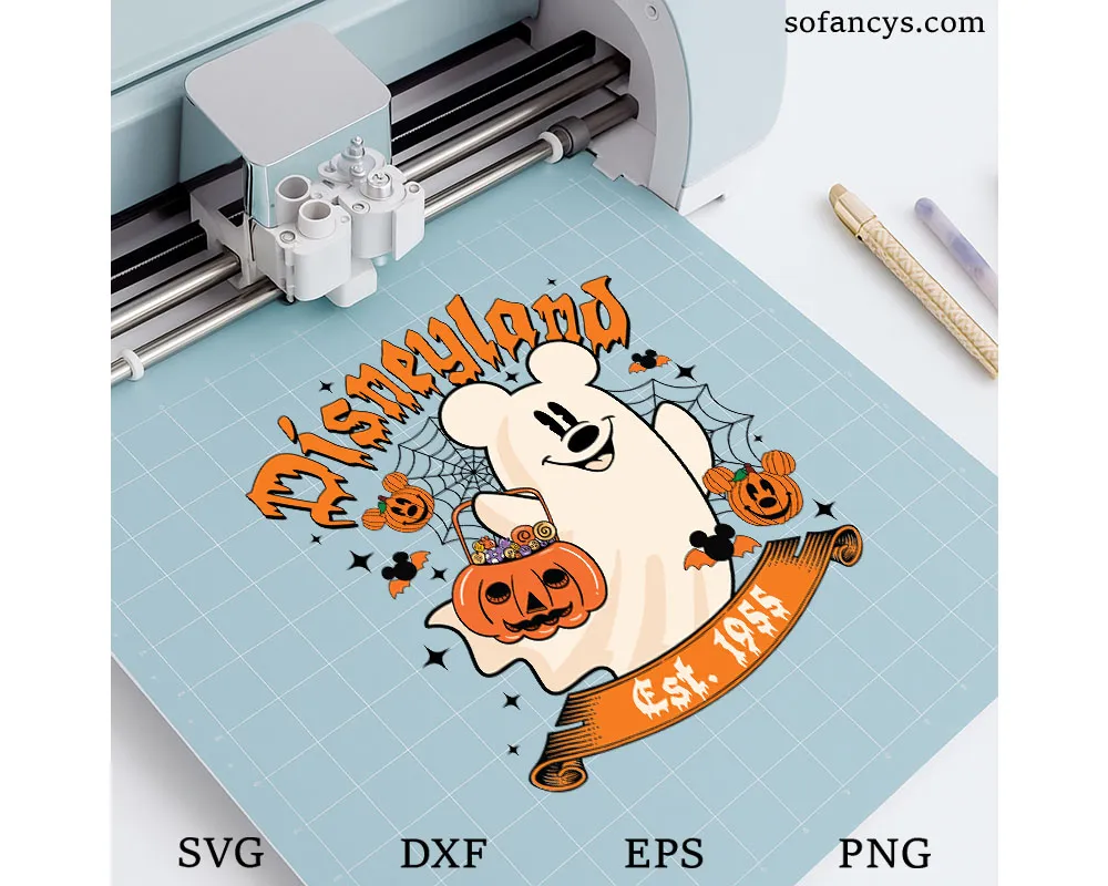 Sofancys introduces the Mickey Pumpkin Ghost SVG – Disneyland Halloween Design, a cute Halloween design featuring a smiling ghost with pumpkin ears and candy basket. Surrounded by webs, bats, and the Disneyland 1955 banner, this charming file captures festive spooky vibes. Perfect for shirts, mugs, or tote bags using Cricut or Silhouette.