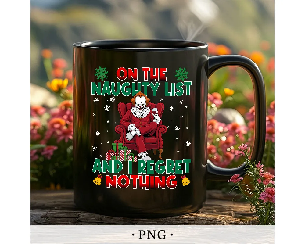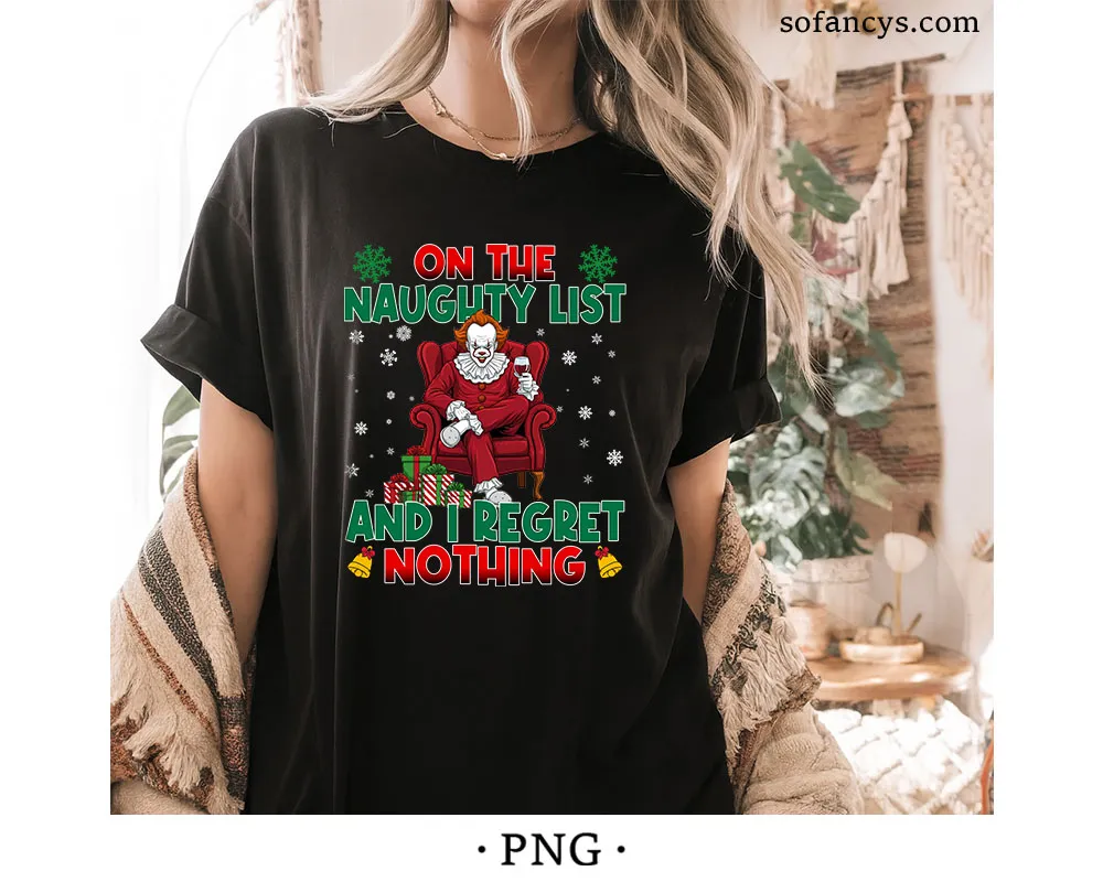 Sofancys introduces a bold and wickedly festive Pennywise Naughty List PNG – Christmas Pajama Horror Art design that mixes dark humor with Christmas spirit. The artwork shows a sinister clown lounging confidently in a red armchair, dressed in holiday pajamas, holding a glass of wine and surrounded by wrapped presents and falling snowflakes. The striking red and green text “On the Naughty List and I Regret Nothing” adds a sarcastic twist perfect for those who enjoy edgy holiday humor. Ideal for shirts, sweaters, mugs, posters, party décor, and DIY gifts, this high-resolution PNG delivers sharp, vivid details for standout Christmas creations.