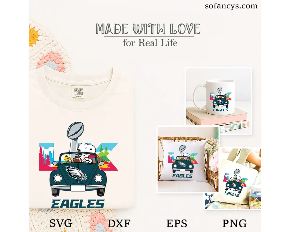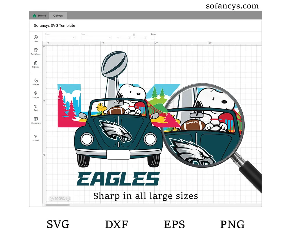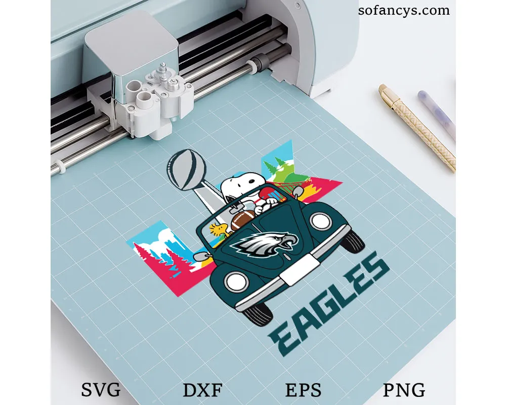 Sofancys proudly presents a playful and energetic football-themed design featuring Snoopy and Woodstock celebrating game day spirit. This artwork highlights the iconic Eagles logo on a vintage car, paired with bold Super Bowl elements and vibrant colors. Perfect for fans who love crafting, game day apparel, and DIY projects, this Philadelphia Eagles Snoopy SVG – Super Bowl LX Cut File is ideal for shirts, decals, posters, and gifts. Clean lines and layered details ensure smooth cutting across popular machines like Cricut and Silhouette.
