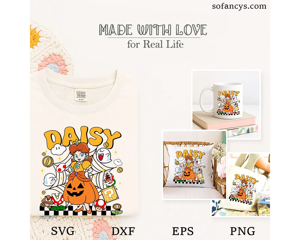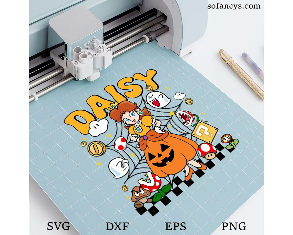 Sofancys presents the charming Princess Daisy Pumpkin SVG – Super Mario Halloween Design, featuring Daisy dressed in a festive pumpkin gown surrounded by classic Super Mario Halloween icons. With bright colors, gold coins, and Boo ghosts, this playful design captures both cute and spooky vibes. Perfect for Cricut, Silhouette, and Halloween crafting projects.