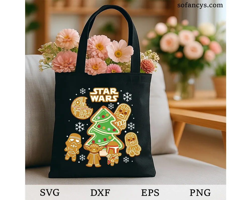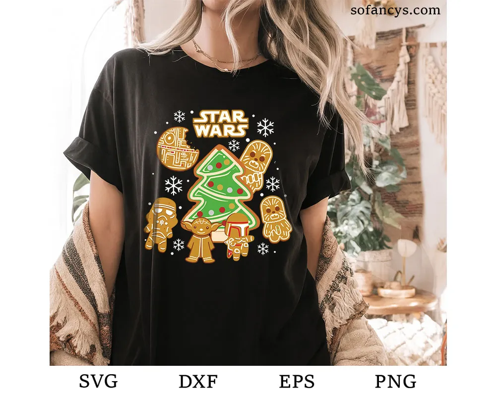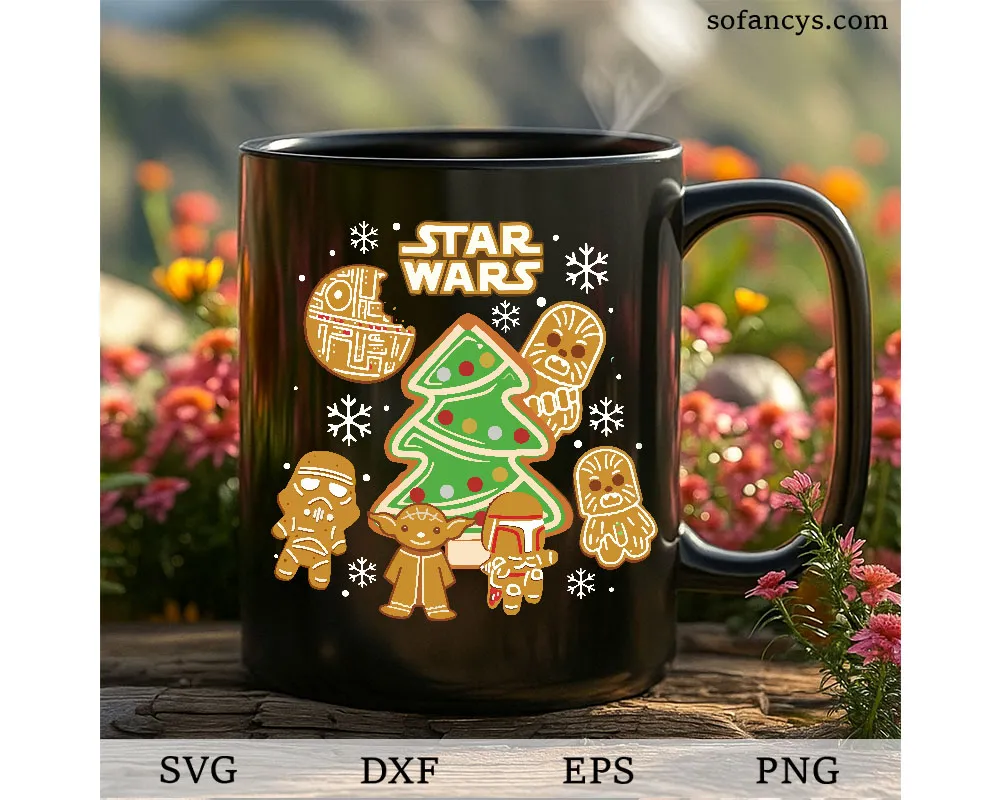 Sofancys presents a sweet and playful Star Wars Gingerbread SVG – Christmas Cookie Holiday Design that blends galactic adventure with cozy holiday baking vibes. The artwork features adorable gingerbread-style characters inspired by iconic space heroes and droids, gathered around a festive Christmas tree cookie. Snowflakes fall across the scene while detailed icing patterns bring each cookie character to life with charming personality. Warm brown cookie tones contrast beautifully with bright green and red holiday accents, creating a joyful and whimsical look. Perfect for Christmas shirts, pajamas, mugs, kitchen décor, party favors, and DIY crafts, this high-quality vector delivers crisp lines and vibrant printing for magical holiday creations.