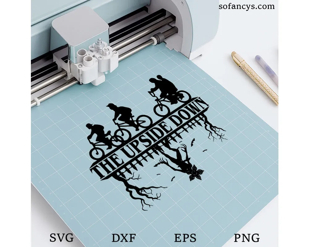 Sofancys presents the The Upside Down Silhouette SVG – Stranger Things Movie Cut File, a dark and striking design inspired by the iconic upside-down world. Featuring a dramatic bicycle kids silhouette with an eerie mirrored effect, this artwork captures the mysterious sci-fi horror atmosphere fans love. Perfect for Cricut and Silhouette machines, it’s ideal for T-shirts, hoodies, posters, wall art, decals, and Halloween crafts. Clean silhouettes and bold contrast ensure smooth cutting and eye-catching results for creative projects and fandom designs.