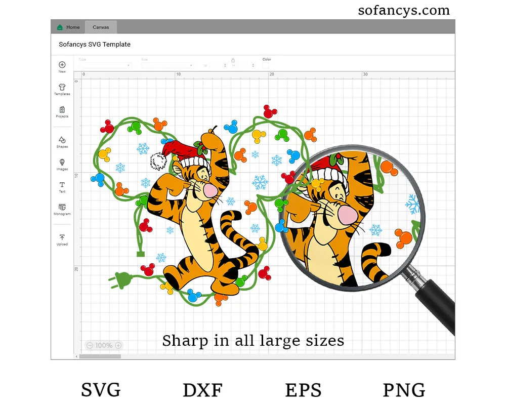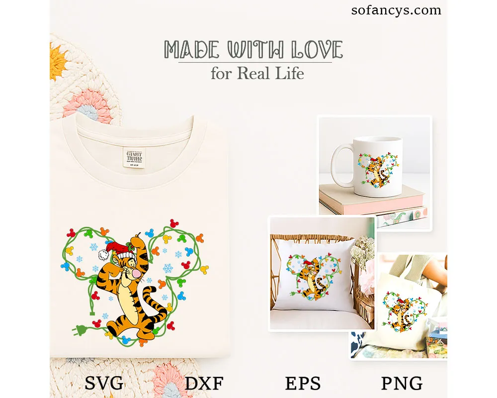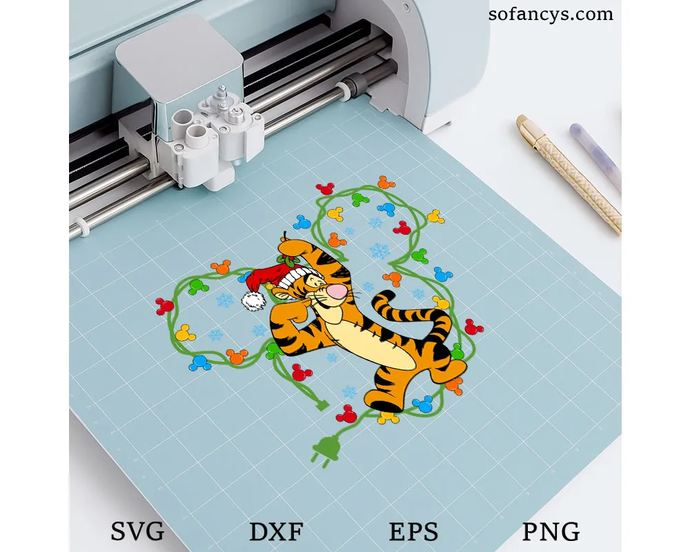 Sofancys introduces the Tigger Christmas Lights SVG – Disney Mickey Ears Xmas Design, a cheerful holiday design featuring Tigger wearing a Santa hat and surrounded by colorful Mickey-shaped Christmas lights and snowflakes. This joyful SVG captures Tigger’s playful bounce and Christmas excitement, blending Disney magic with festive spirit. Perfect for Cricut and Silhouette projects, it’s ideal for making holiday shirts, mugs, cards, and decorations that spread warmth, laughter, and holiday cheer to your Christmas crafting collection!