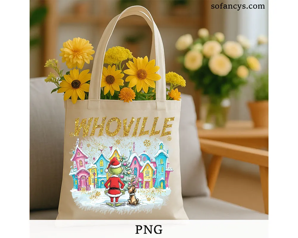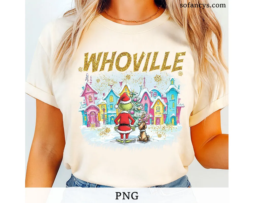Sofancys giới thiệu thiết kế Whoville Christmas Scene PNG – Grinch Town Retro Holiday File, tái hiện thị trấn Whoville đầy sắc màu dưới lớp tuyết lung linh. Hình ảnh Grinch và chú chó Max đứng trước những ngôi nhà retro rực rỡ mang đậm không khí Giáng Sinh cổ điển. Hiệu ứng tuyết vàng kim và phối màu pastel tạo nên một khung cảnh ấm áp, hoài niệm, hoàn hảo cho áo phông, cốc, poster hoặc trang trí mùa lễ hội.