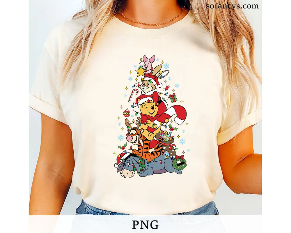 Sofancys presents this adorable Winnie Pooh Christmas PNG – Cute Friends Holiday Tree Design, featuring Pooh, Piglet, Tigger, Eeyore, and Rabbit stacked into a festive Christmas tree shape. Each character is dressed in cozy holiday attire, surrounded by ornaments, candy canes, gifts, snowflakes, and sparkling lights. This heartwarming design captures the joyful spirit of friendship and Christmas magic, perfect for shirts, cards, posters, and seasonal crafts.